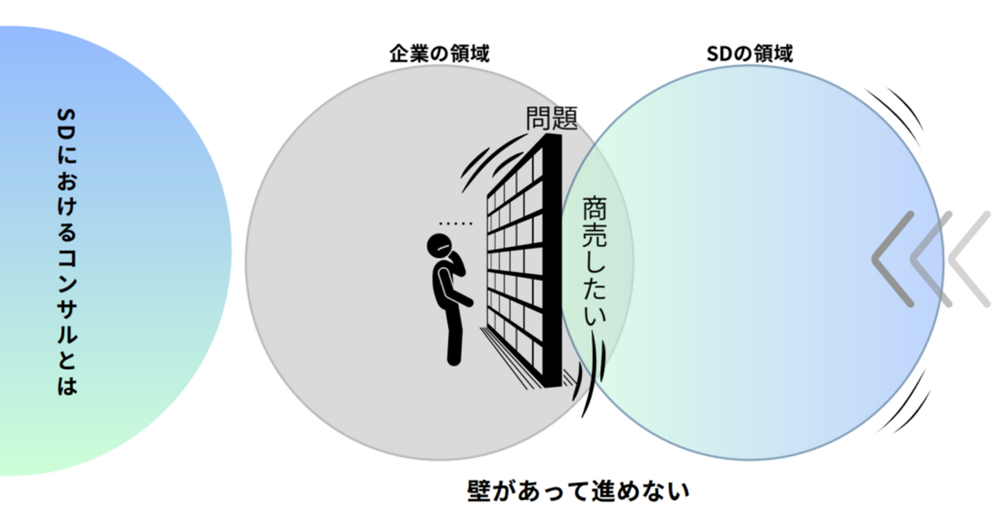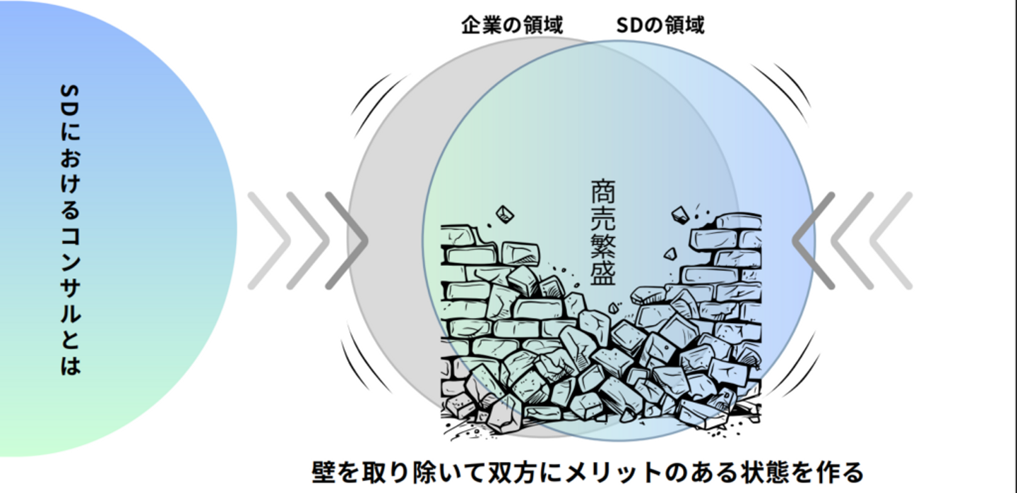 その壁があって前に進めないときに、僕たちコンサルの役割は『その壁を壊すこと』になります。最終的には、スーパーデリバリーの領域と企業の領域がもっと大きく重なって、商売繁盛するような状態を目指していく。これが、スーパーデリバリーにおけるコンサルの役割だと思っています。