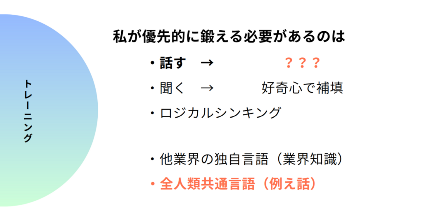 そこから今日のテーマに繋がります。『仕事で必要な能力をどうやって鍛えるのか』『どんなトレーニング方法があるのか』という話です。