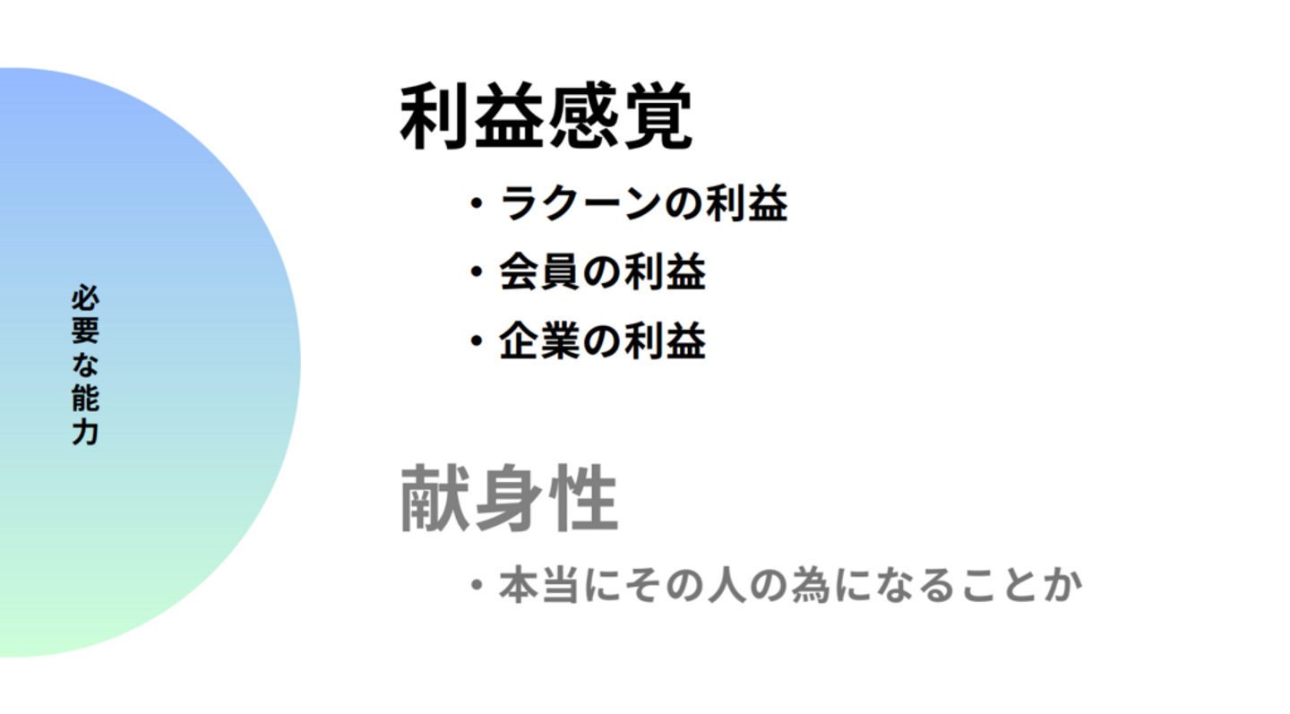 『利益感覚』は、『どのくらいの利益が出る話なのか』という感覚です。『これをやることでどのくらい利益が出るのか』『それは企業さんのためになるのか』『会社(ラクーン)のためにもなるのか』といったことをイメージしやすくなるので、『どのくらい儲かる話なのかな?』という視点を常に持っておくと良いのではないかと思います。