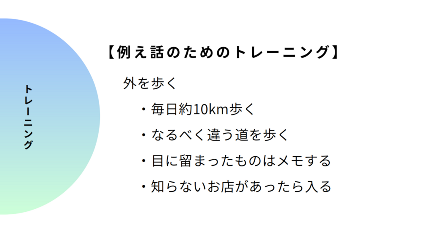 次に、例え話のトレーニングについてです。僕の場合は、『外を歩く』ことが一番良かったです。今でも、だいたい毎日10〜15kmくらい歩いています。