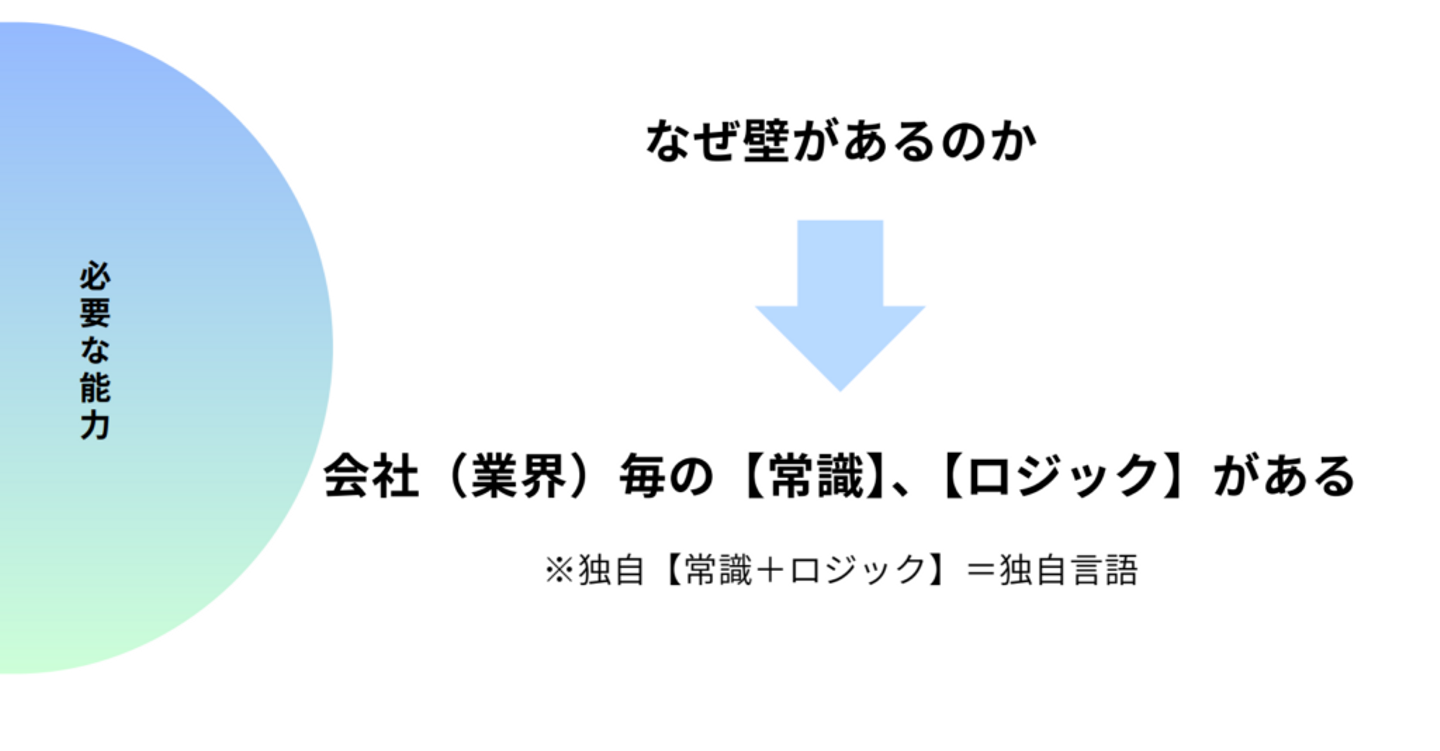 先ほど、企業には『壁』があるという話をしました。なぜ壁が生まれるのかを言語化してみると、会社や業界ごとに、その業界ならではの『常識・ロジック』があるからです。ここでは『常識・ロジック』という言葉だと少し分かりにくいので、『独自言語』と表現しておきます。