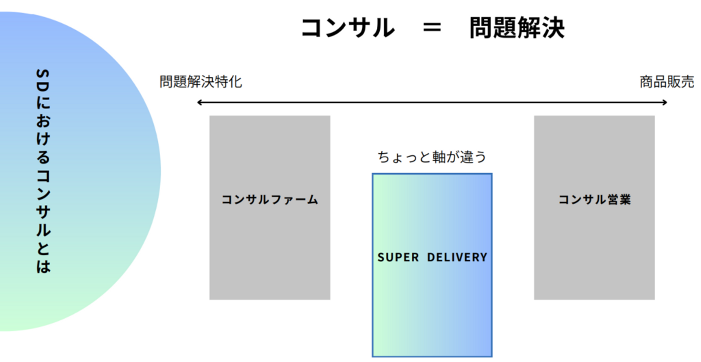そういったコンサルファームの人たちは、問題解決に特化した仕事、問題を解決することで成功報酬を得るビジネスモデルになっています。これは、スーパーデリバリーでやっているコンサルの仕事とは、少し違います。