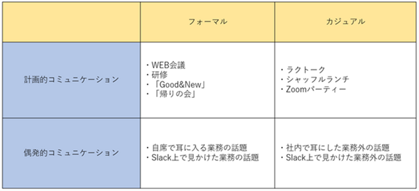 社内コミュニケーションは「計画的コミュニケーション」と「偶発的コミュニケーション」の2つに大別され、そのなかでもフォーマルなものとカジュアルなものがあると考えています。業務上必要なフォーマルなコミュニケーションはもちろんのこと、リモートワークで減少しがちなカジュアルなコミュニケーションも活性化できるように、デジタルツールを活用して施策を実施してきました。