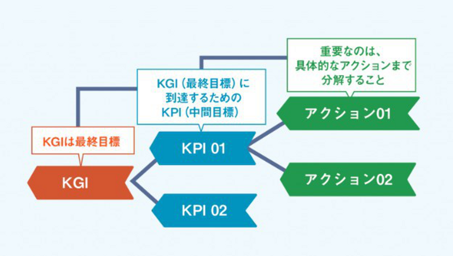 またこのようなKPIはまだ抽象的であるので一つ一つに対してKPIをKGIに変え、さらに細かいKPIを複数置いて常に逆算してアクションして行くことが大事です。