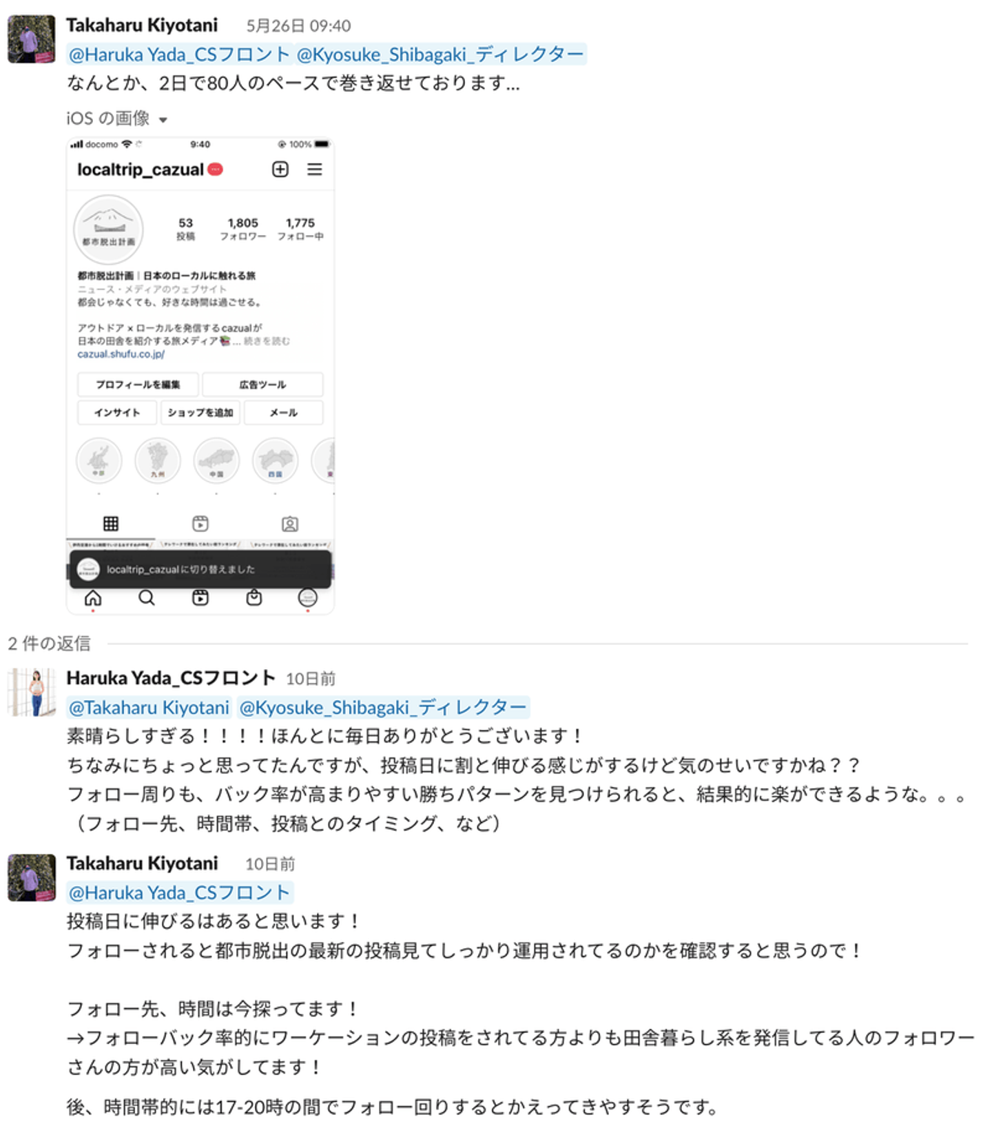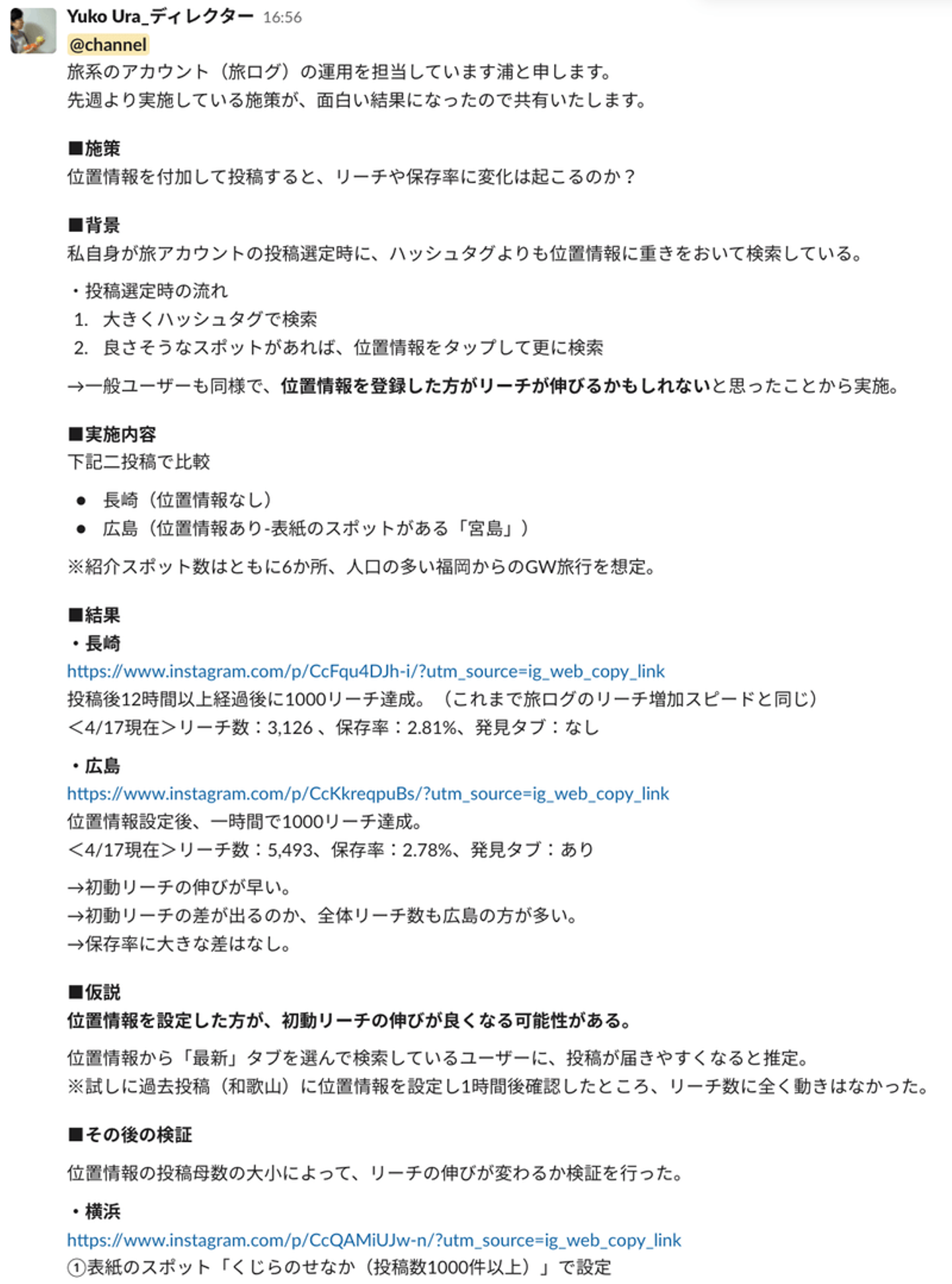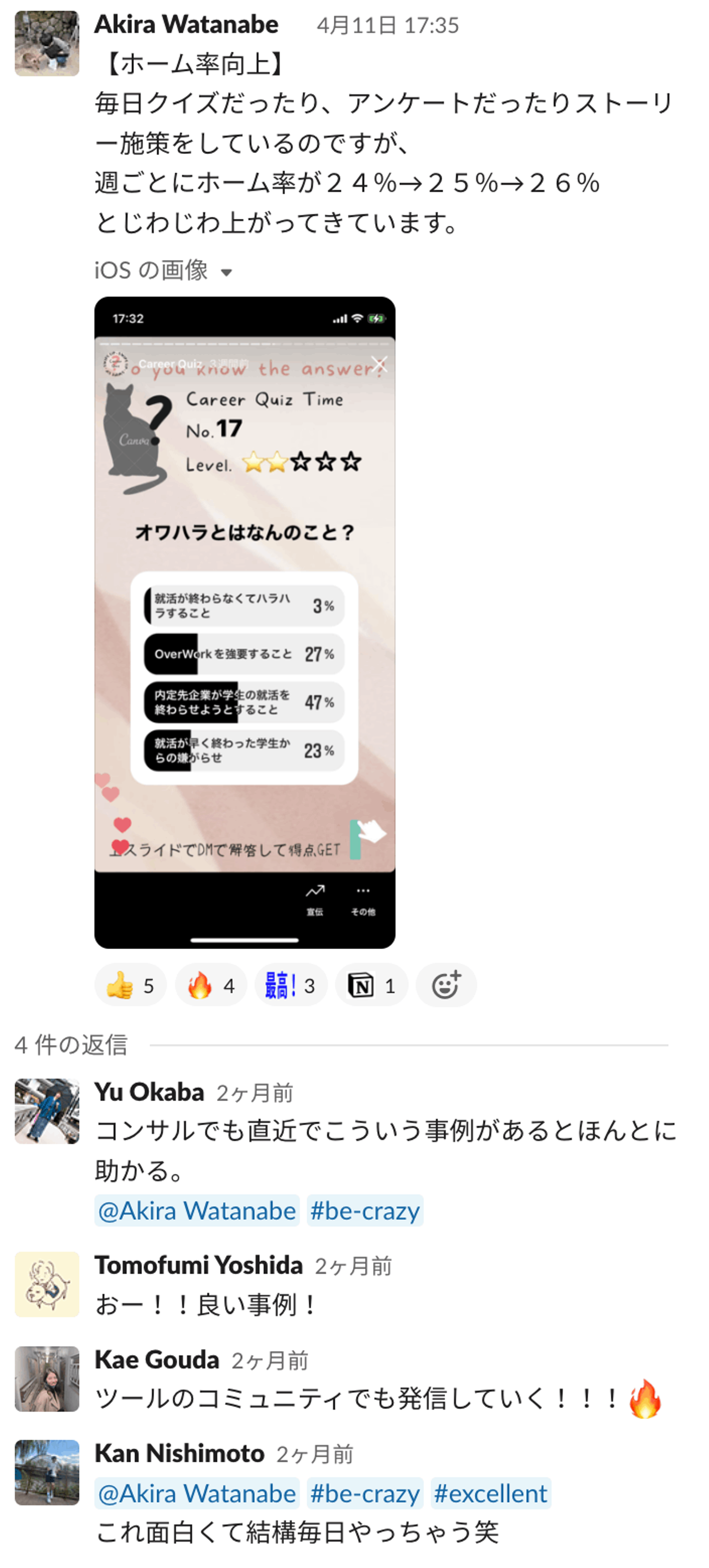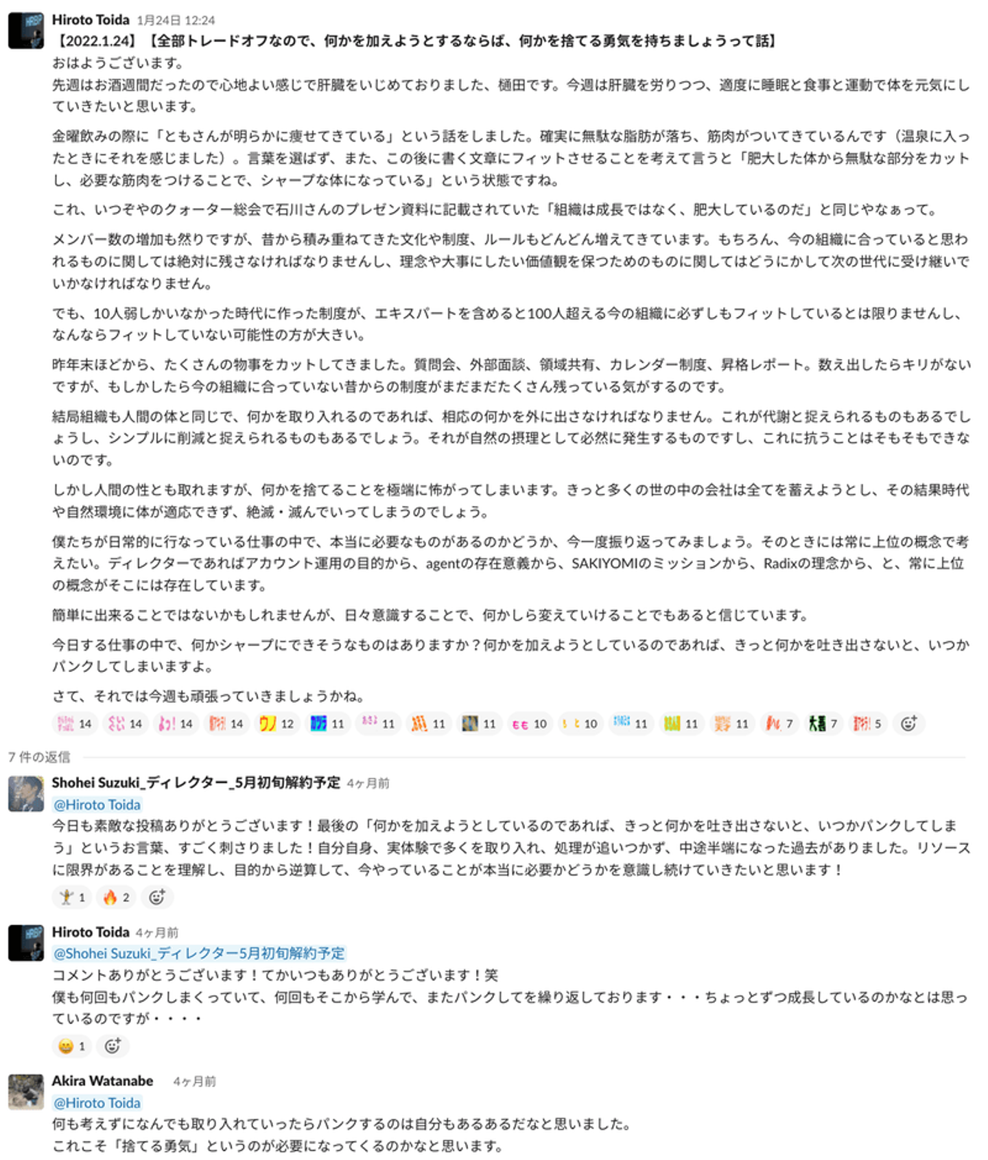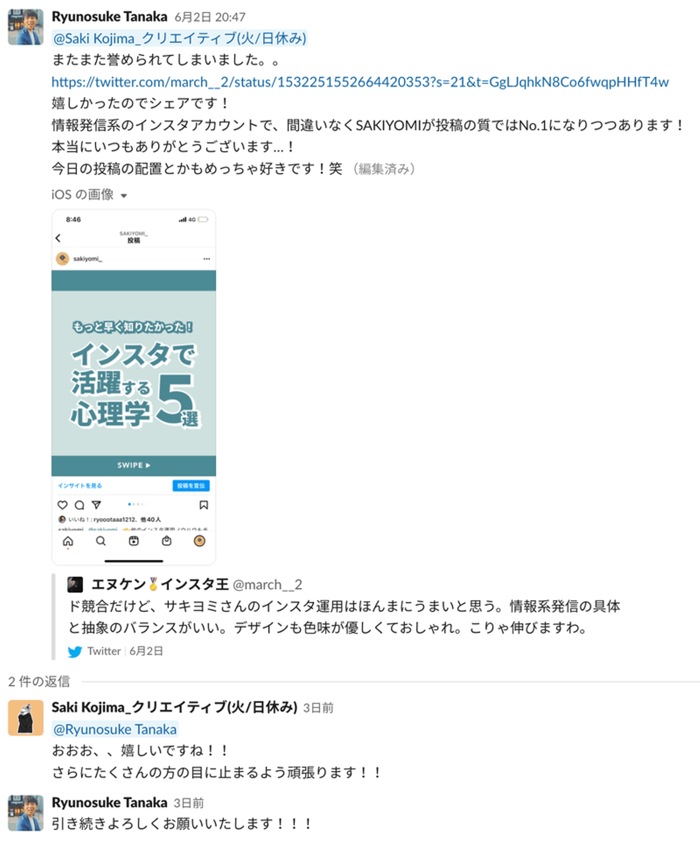 入社してたった2ヶ月くらいの業務委託の方が発信したメッセージ。運用している中で発見したノウハウがとても有益だということで、積極的に発信をしてくださっています!