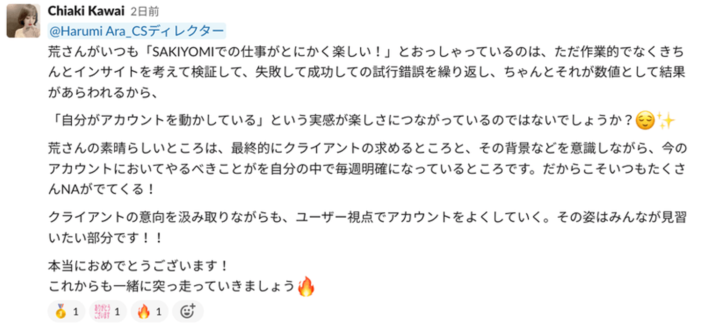 こちらの画像、発信しているのがインターン生で、返信しているのが業務委託の方。業務委託の方であっても、積極的にSlackでの発信をしてくださり、お互いに社内・社外といった概念を超えて讃えあう文化が生まれています。これはSAKIYOMIならではかもしれませんね。