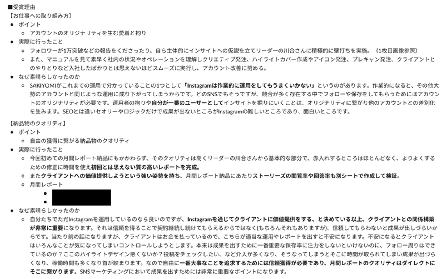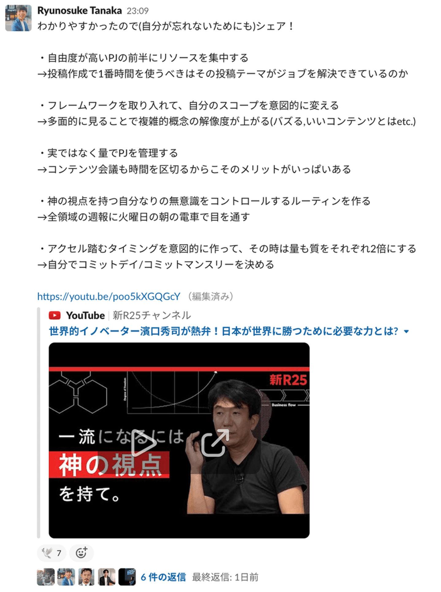 SAKIYOMIのマーケティング責任者からの「仕事の進め方のコツ」についての発信。責任者クラスも積極的に発信をしてくれることで、他のメンバーが仕事の参考にしやすい状態を作れています。