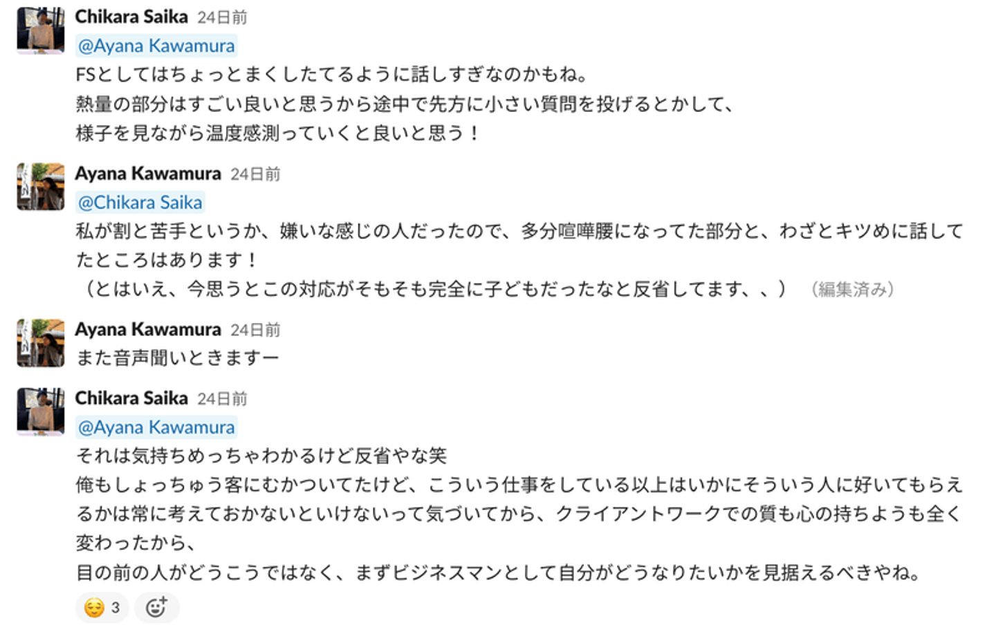 こちらは営業チームメンバーと、インターン生の会話。インターン生が取り組んでいたクライアントワークに対して、営業メンバーからフィードバックが入っている様子。オープンなチャンネルでこうしたタメになるやりとりをしてくれるため、仕事へ取り組む姿勢も正される思いです…!