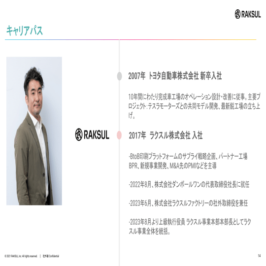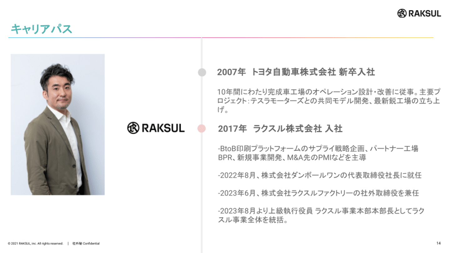 そして、事業をグロースさせる1→10、10→100のフェーズで、数百億円規模の印刷事業リーダーとして経験を積んだり、M&A戦略の一環としてダンボールワンという会社をラクスルと統合し、提供価値を高めることにダンボールワン株式会社のCEOとして取り組みました。