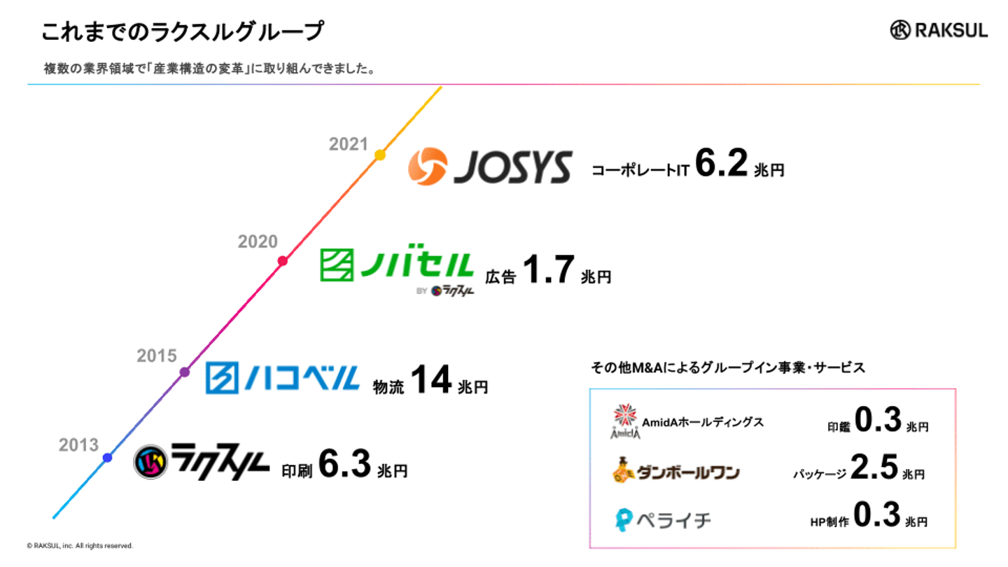 これまでデジタル化が進んでいない伝統的な業界にインターネットを持ち込み、産業構造の変革に取り組んできました。祖業である印刷・集客支援のプラットフォーム「ラクスル」をはじめ、マーケティングのプラットフォーム「ノバセル」、物流のプラットフォーム「ハコベル」、ITデバイスとSaaS統合管理サービスの「ジョーシス」など、内製での事業立ち上げと連続的なM&Aによって、事業と顧客の領域を拡張させながら、独自の強みを有するポートフォリオカンパニーへと成長しています。