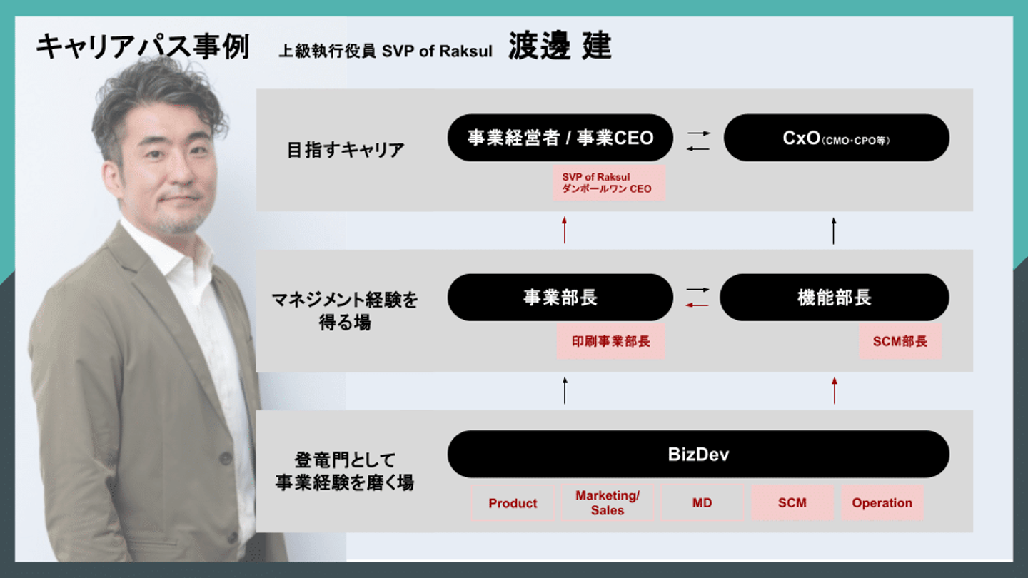 ラクスルには事業責任者になる大まかなルートがあります。私たちは事業開発(BizDev)と呼んでいますが、サービスを創る上でプロダクトやマーケティングなど、あらゆる要素を自分で弾けるようにならないと、事業責任者にはなれません。