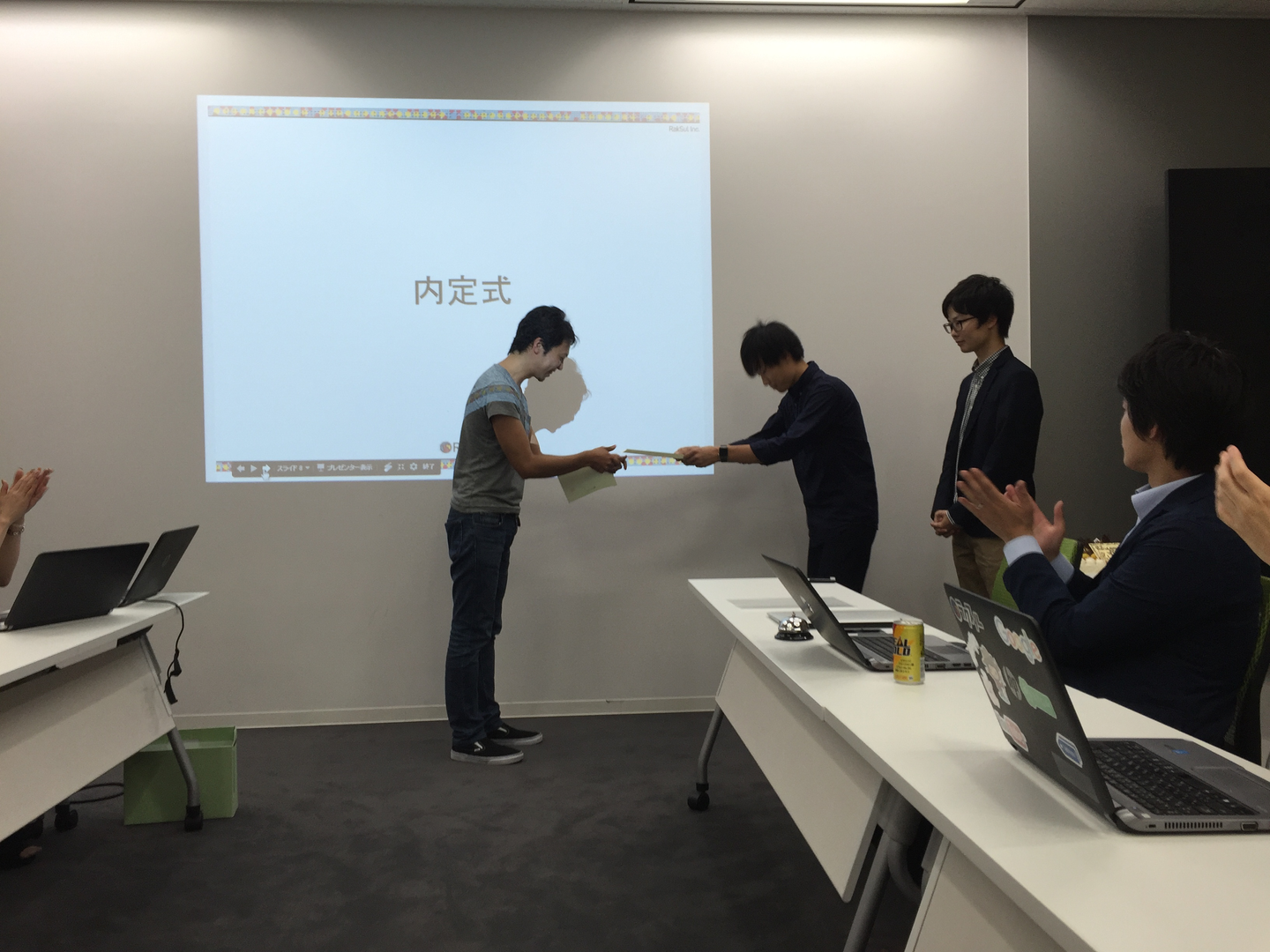 当日は、内定式の前に9月の振り返り&社長賞の発表に同席しました。振り返りは各部署ごとひとりずつ、目標に対する達成度合を発表していました。ピリピリした雰囲気を感じ、いよいよ社会人としてスタートするのだと感じました。