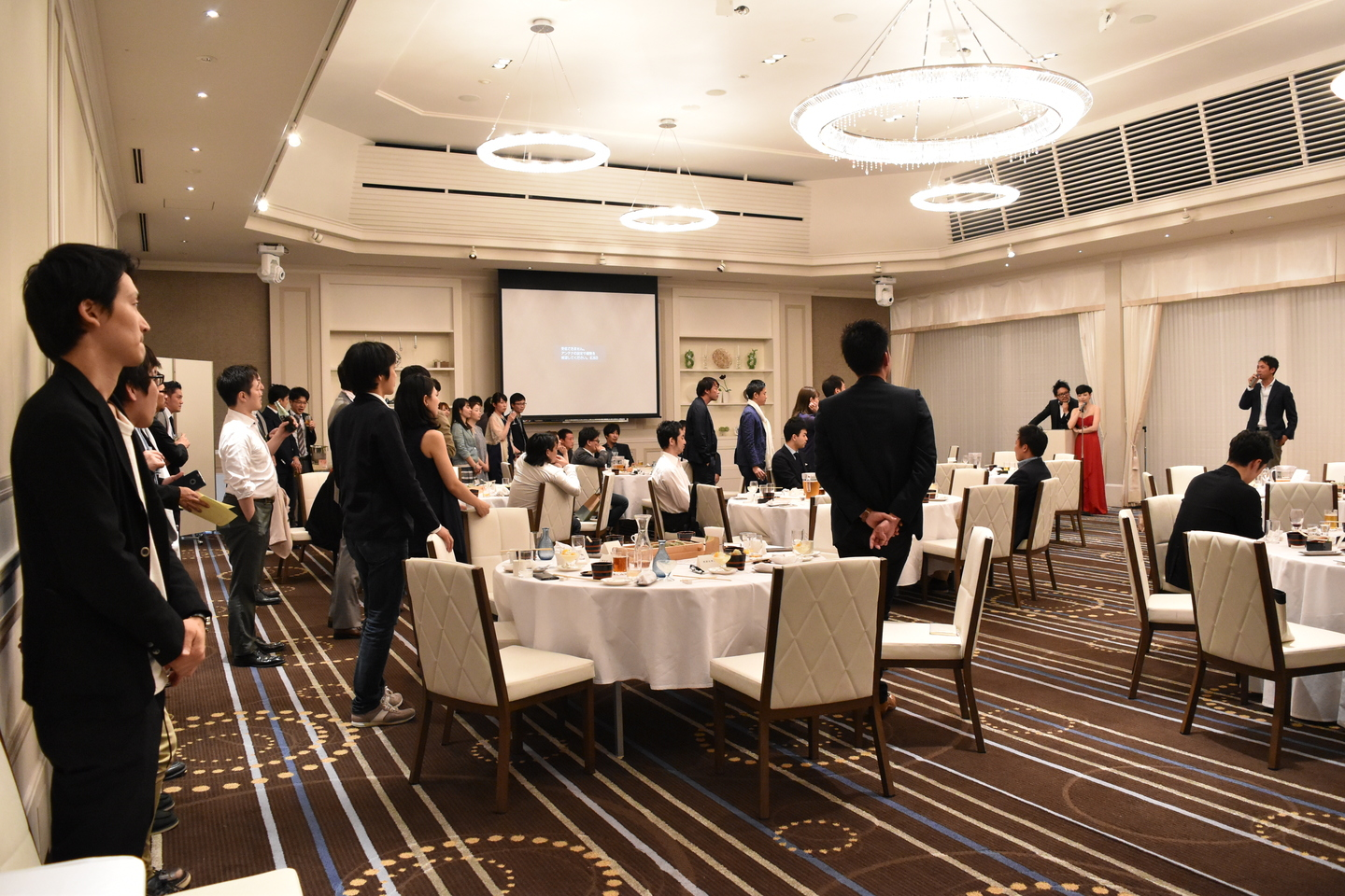 そうして、半日にわたる全研修が無事終了!チェックインを済ませたら、いよいよ晩餐会の開宴です。「ドレスアップして参加すること!」という難易度高めのドレスコードでしたが、普段はTシャツにGパンとラフな格好のメンバーたちも、思い思いのおしゃれをして参加してくれました。いつもと違うメンバーの華やいだ姿に、会場内のテンションもアップ!新潟のおいしいお酒と料理を堪能しながら、普段なかなか話す機会のないメンバー同士の会話も弾みます。途中、ベストドレッサー投票の他、社員の事前投票によるMVP(もっとも事業に直結する活躍をしていると思う人)とMVS(この人がいないと困る!という縁の下の力持ち)の表彰式なども実施。終始賑やかな宴会となりました。