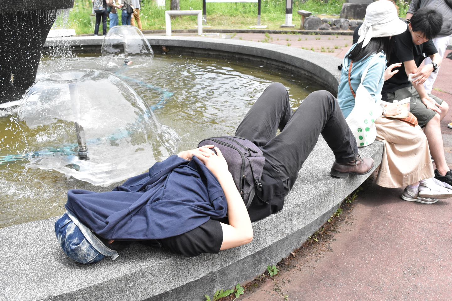 ▲「いやー、熱いっすねーーー」と、他のチームメンバーを残してしばし木陰で休憩したり