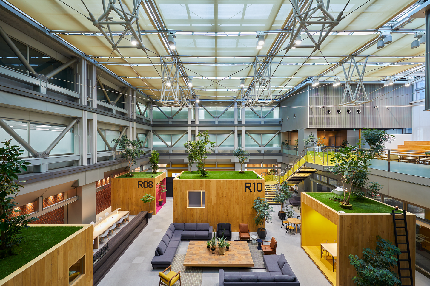 天井もあえてスケルトン状態にすることで、4mという高さを確保。アトリウムの12mには及びませんが、それでも一般的なオフィスに比べたら十分な“天高”と言える高さです。