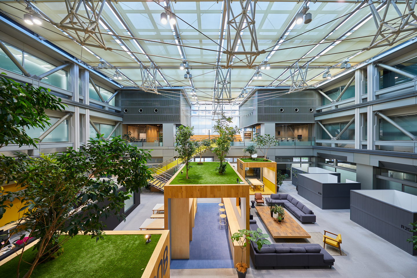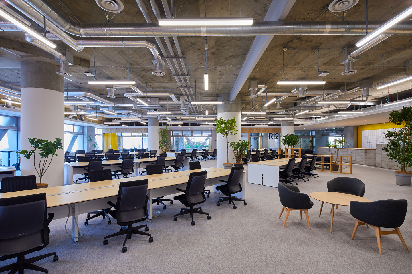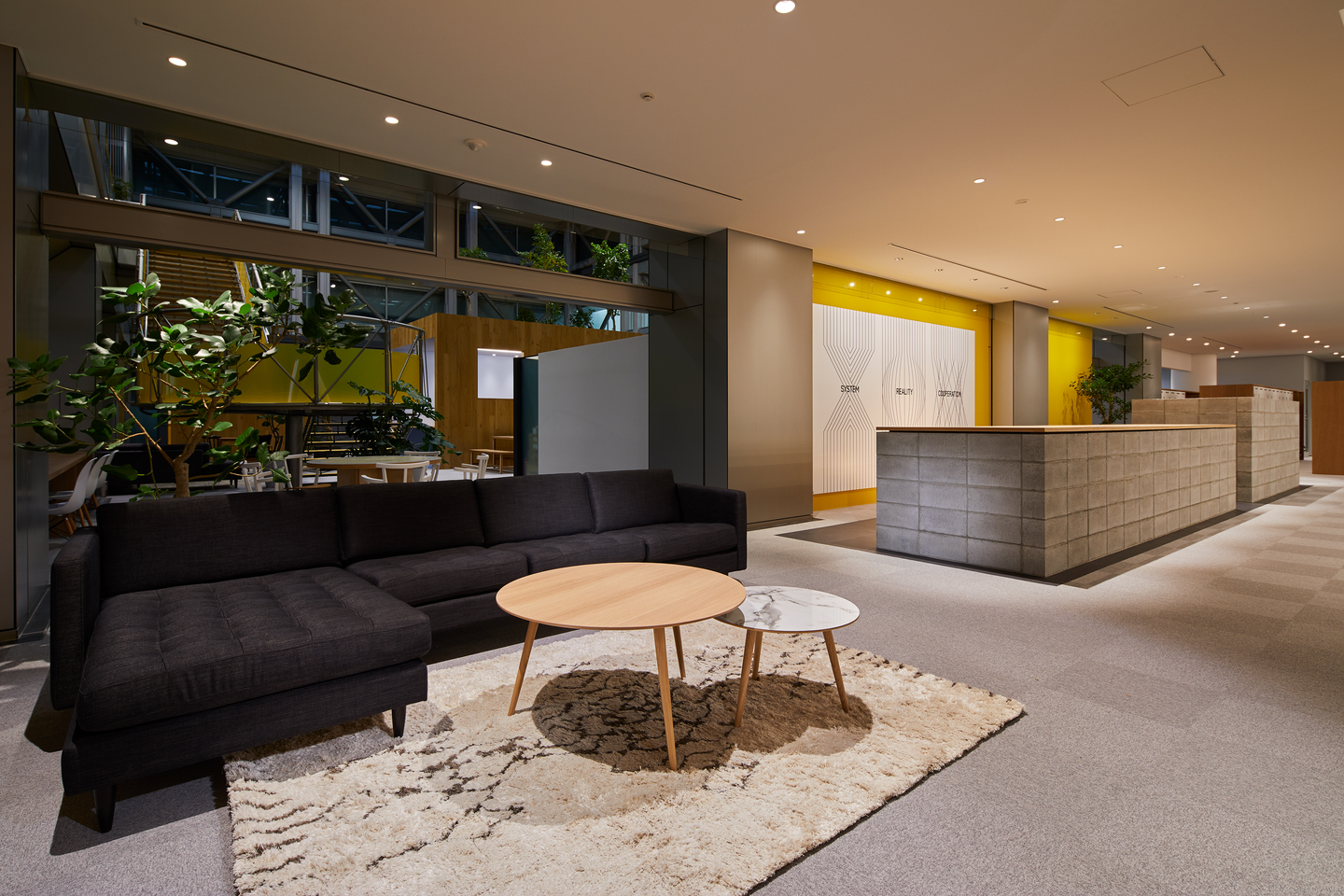 思い返せば、2年前。高さ12mのガラス張りの天井に度肝を抜かれた目黒オフィスではありますが、まさか今度は横に広くなるとは・・・執務エリアがすべて拡張後のスペース(“フォーラム”と名付けました)に移ったため、これまで執務エリアとして利用していたアトリウムはラウンジ的な空間に。