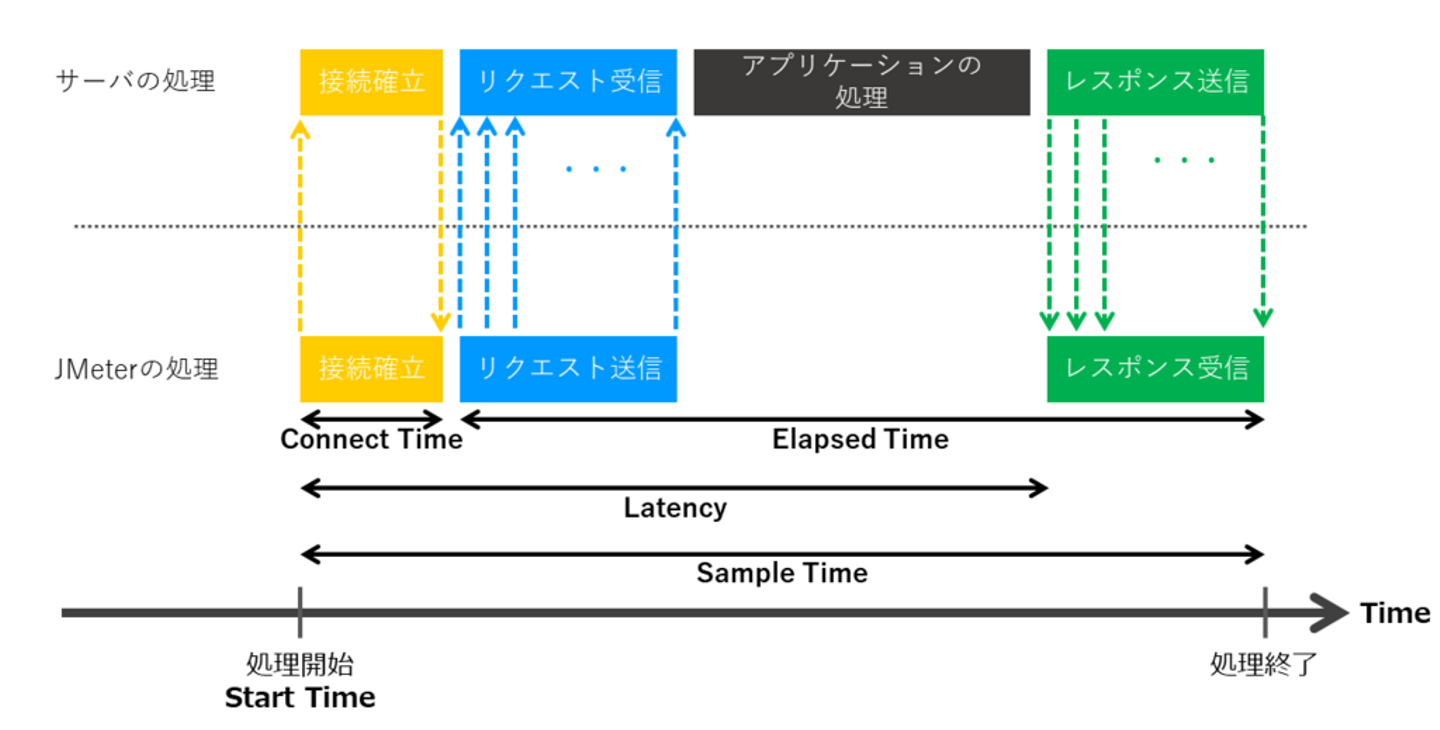 JMeterが1リクエストを送信してレスポンスを受信するまでの処理は、上の図のように行われます。