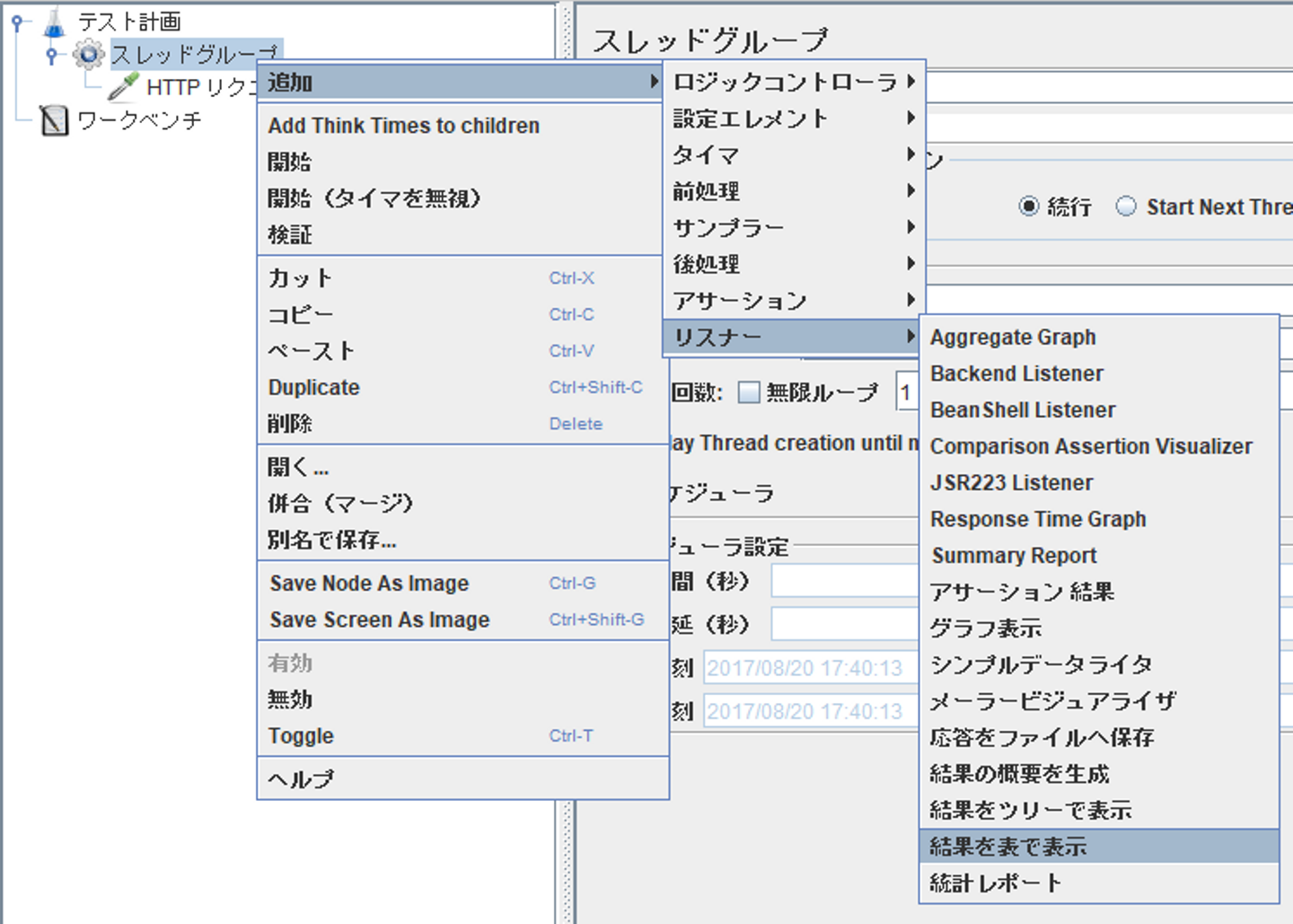 左画面のスレッドグループを右クリックし、 追加 > リスナー > 結果を表で表示