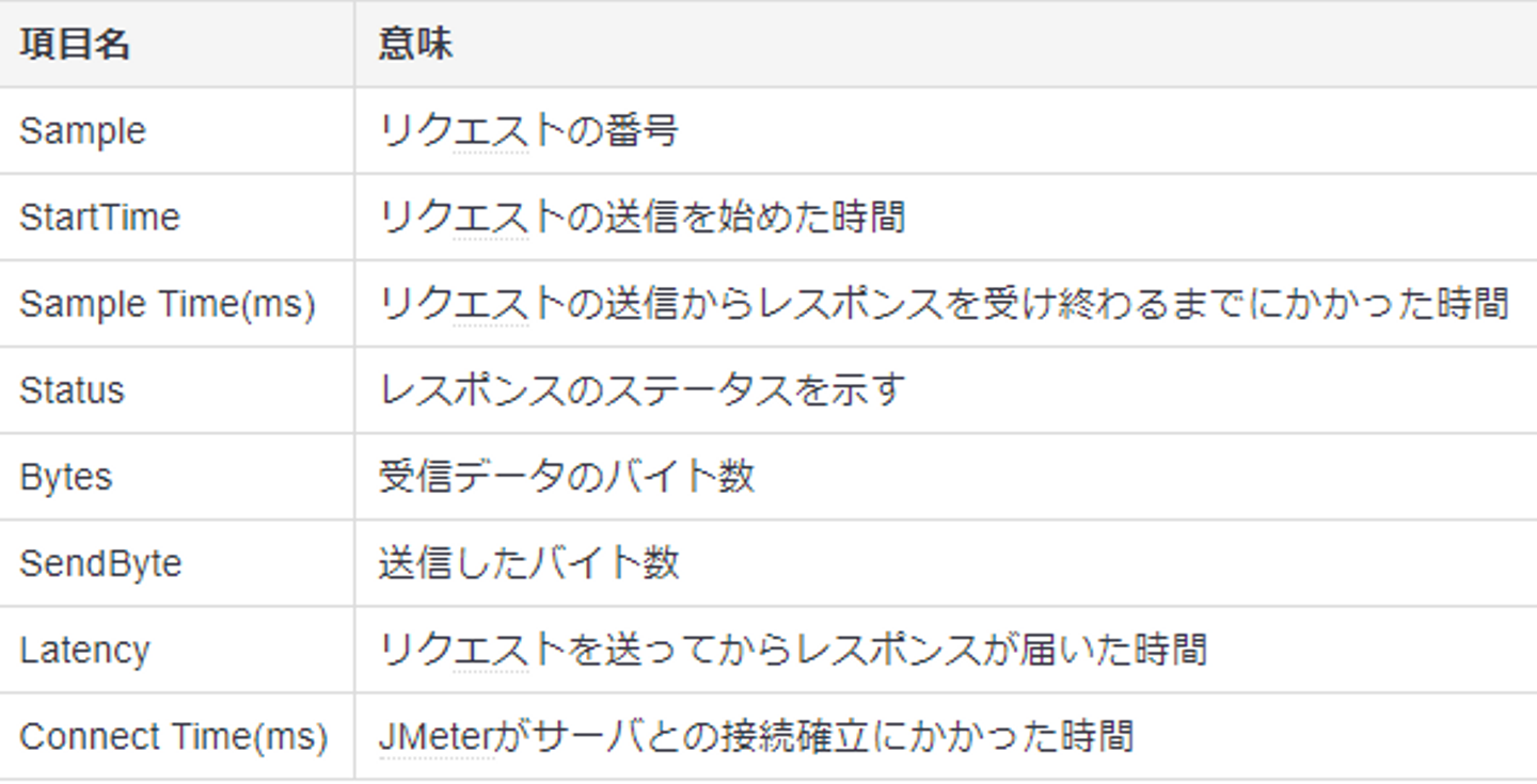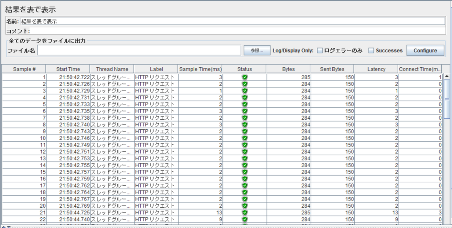 以下の画面では、スレッド数:5、Ramp-Up期間:10秒、ループ回数:20 でテストを実施した場合の「結果を表で出力」画面です。