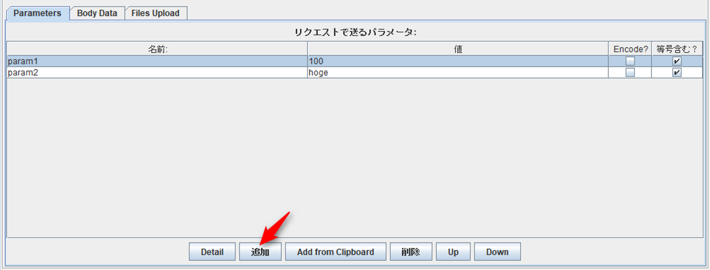 送信するリクエストパラメータを設定します。 画面下の「追加」ボタンから複数追加することができ、パラメータの名前と値をそれぞれ指定することができます。
