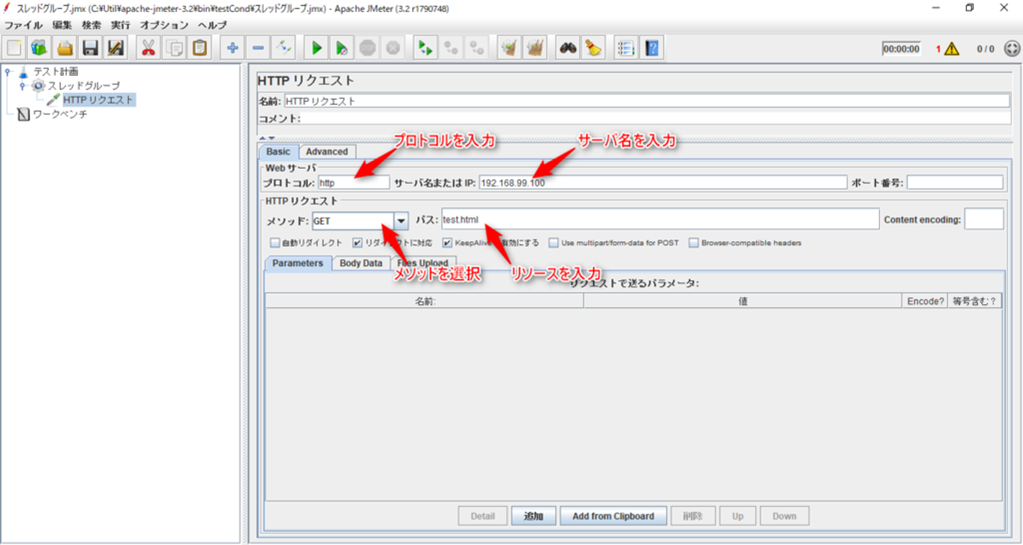 JMeterはGUIモードとNon-GUIモードがありますが、ここではGUIモードの説明をします。 今回は例として、サーバ192.168.99.100のtest.htmlに2つのパラメータ「param1」と「param2」を送信する例を考えます。