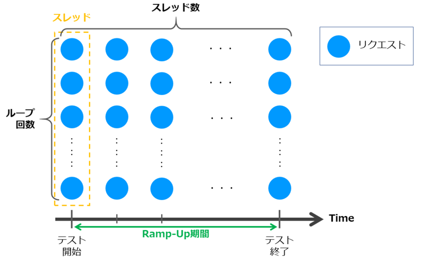 これらを決定するのが、スレッド数、Ramp-Up期間、ループ回数 です。