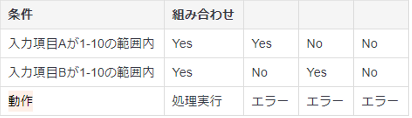 同値分割や境界値分析は、入力項目が複数ありさらにそれらが相関している時には大変ややこしくなります。デシジョンテーブルではそれらの入力の組み合わせを表にして、各組み合わせに対して期待される出力をまとめていく方法です。