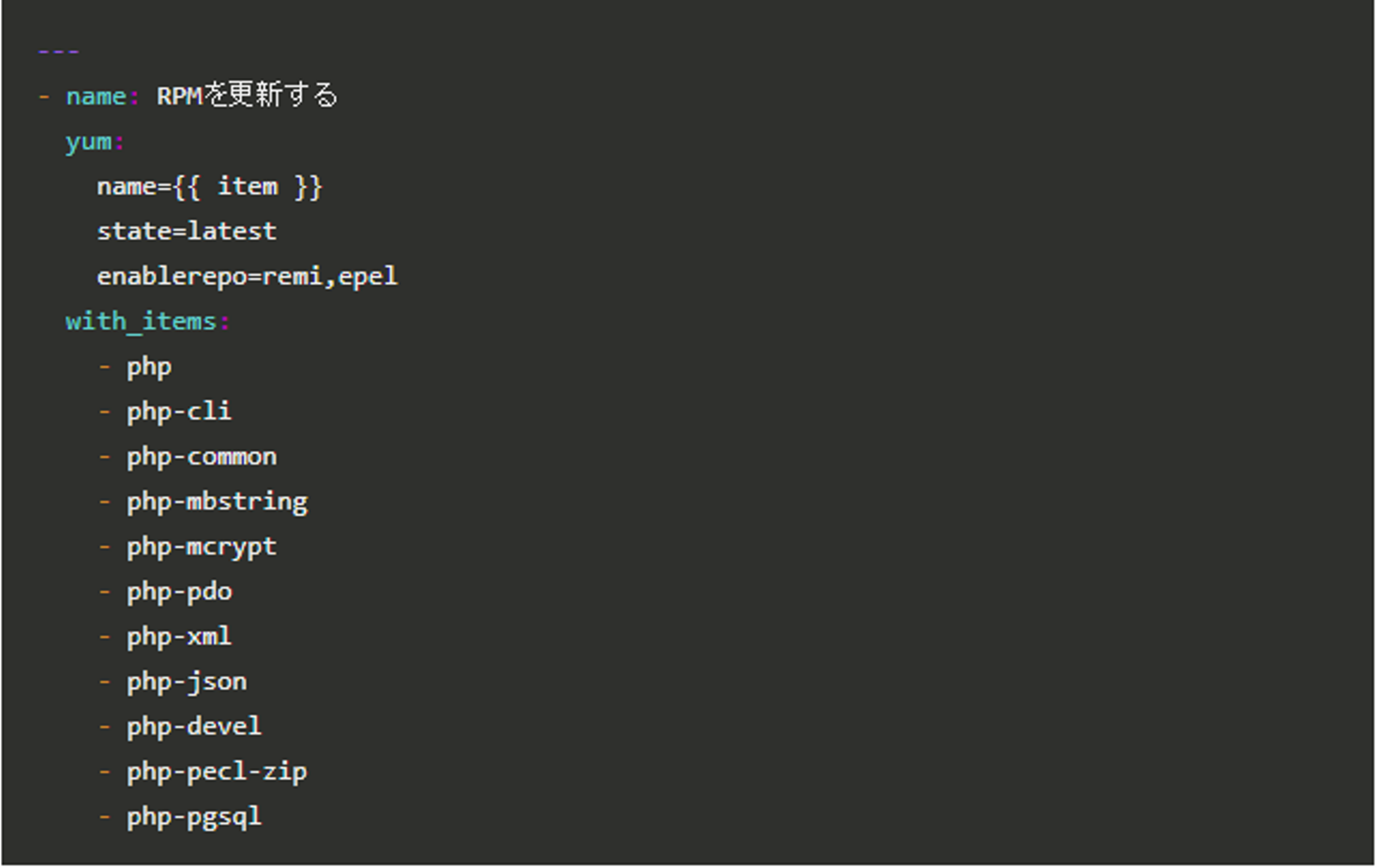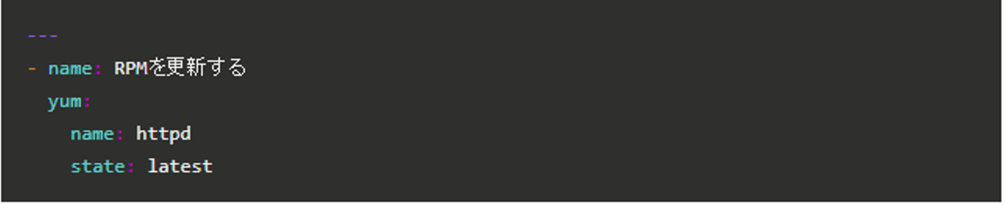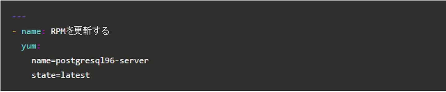 RPMがyumコマンドでバージョンアップできる場合は、「yum」モジュールを利用して「latest」の状態に更新します。