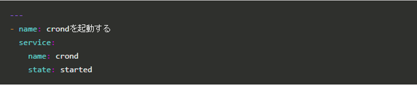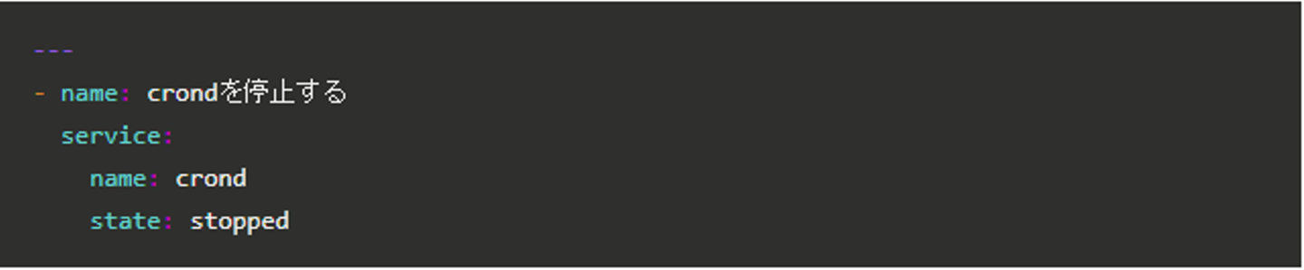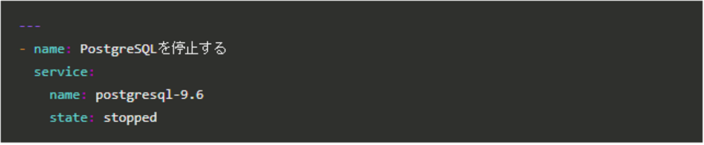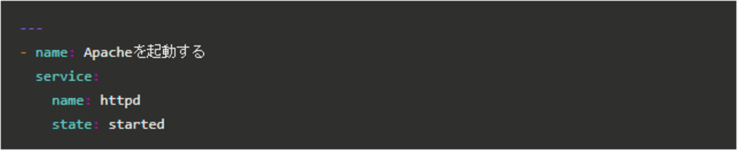 service コマンドが準備されているミドルウェア(デーモン)であれば、「service」モジュールを使って以下のように記述します。