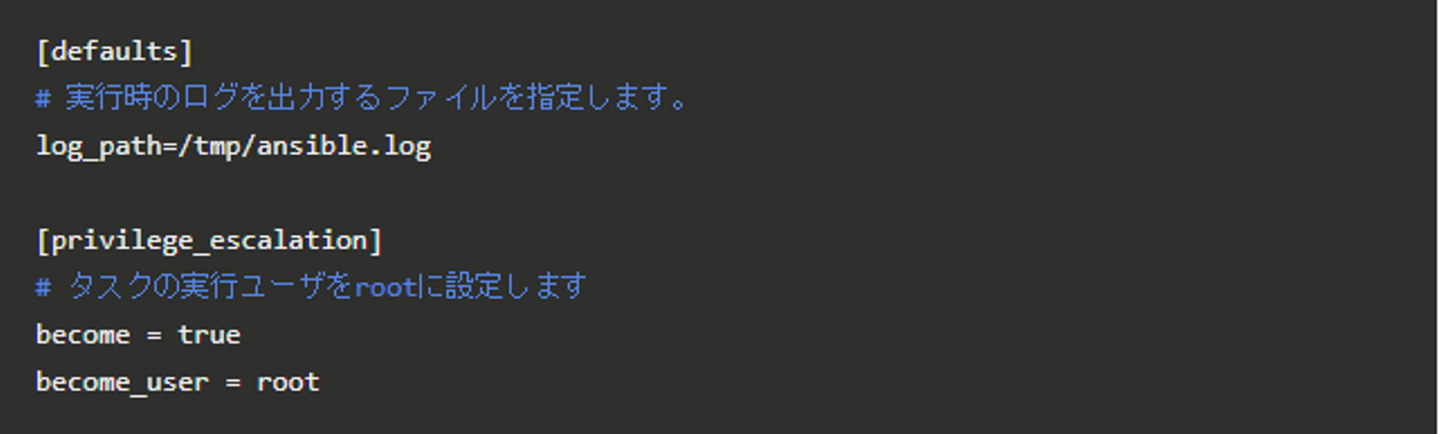 Ansibleの動作設定を記述するファイルで、INI形式で記述します。