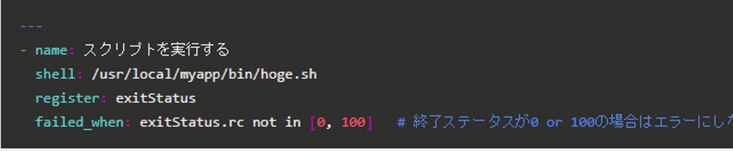 shell モジュールは終了ステータスコードが0以外は、すべてエラーとして処理を中断しますので注意が必要です。 ステータスコードが0以外でも処理を継続する場合には、下記サンプルを参考にしてください。