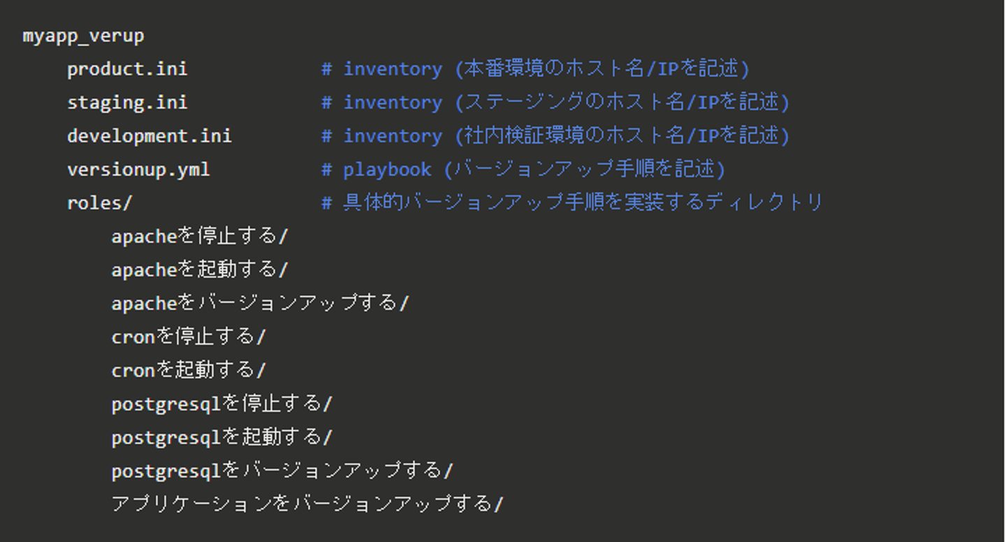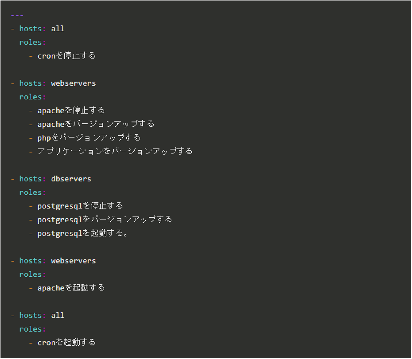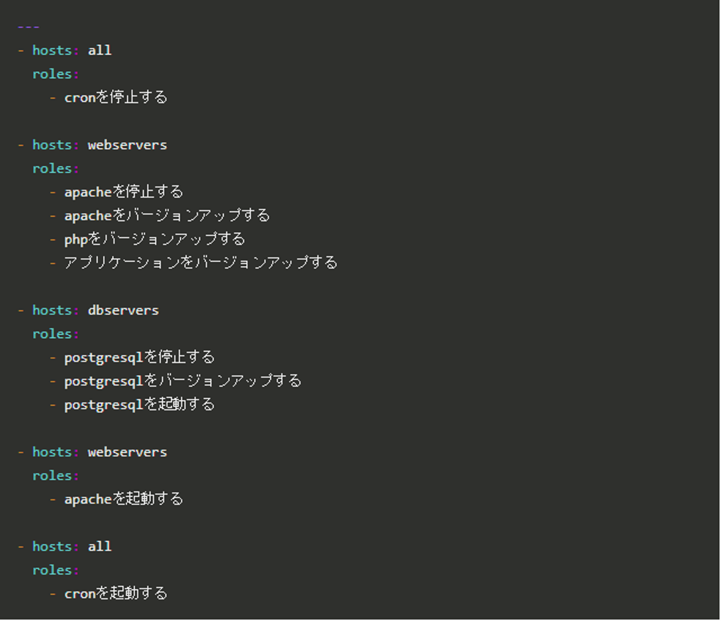 Playbookには、バージョンアップ手順を記述します。