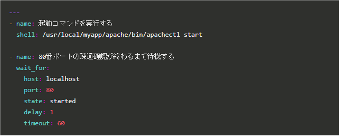 service コマンドが提供されていないミドルウェアの場合は、「shell」モジュールと「wait_for」モジュールで実装することもできます。
