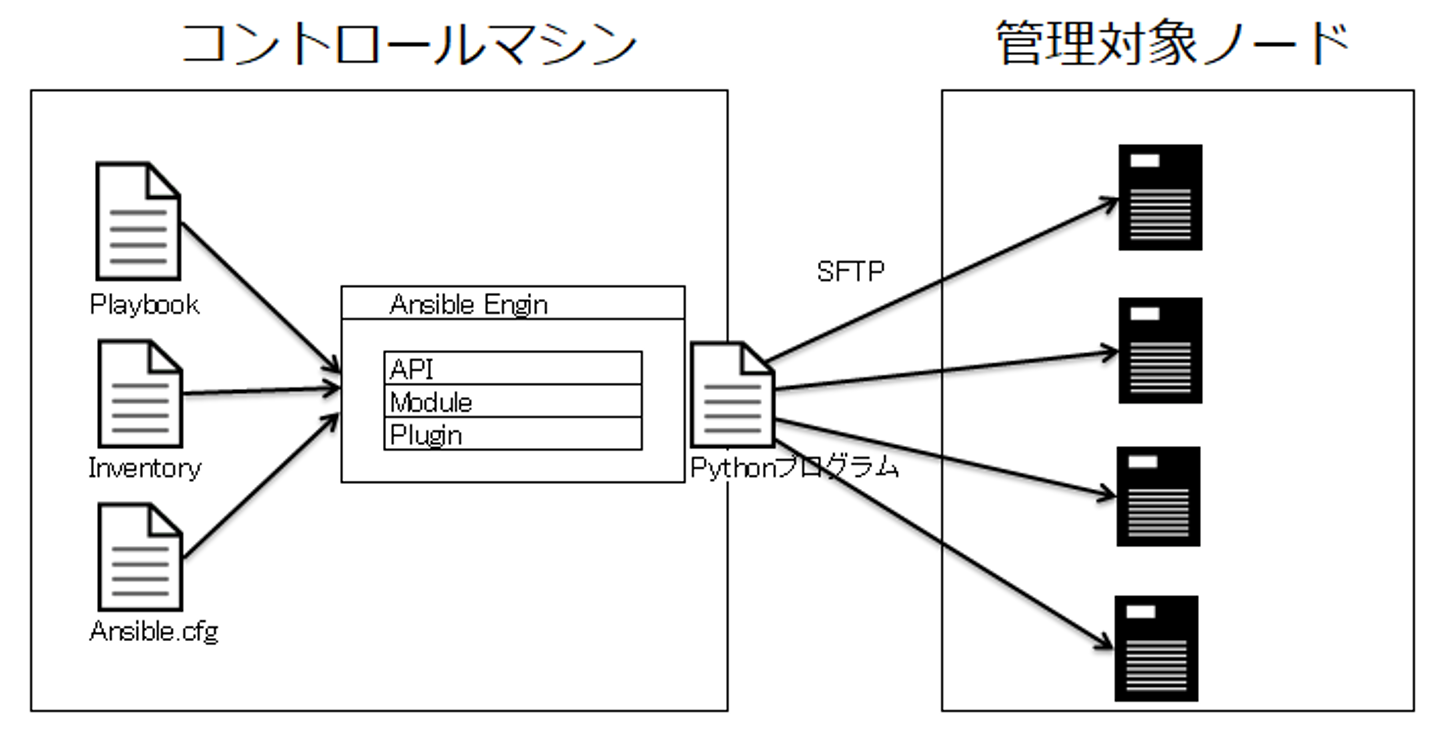 変換されたプログラムファイルは、Inventory(インベントリ)に記述された管理対象ノードに転送後に実行されます。