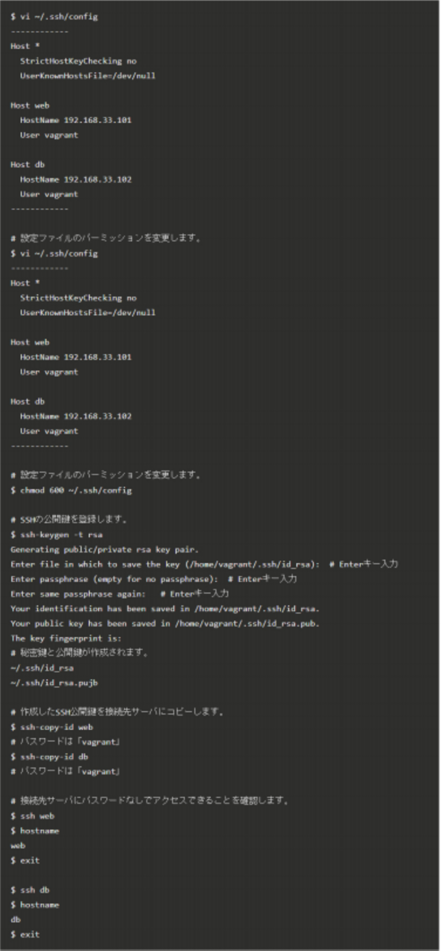 接続先サーバへのSSH接続を簡単にするためSSH設定を記述します。