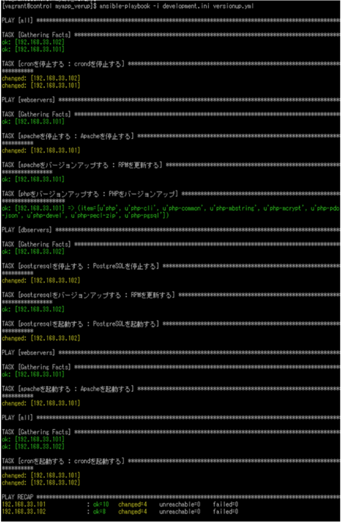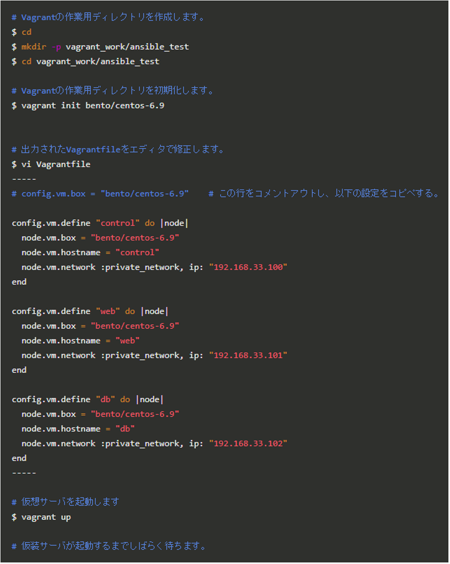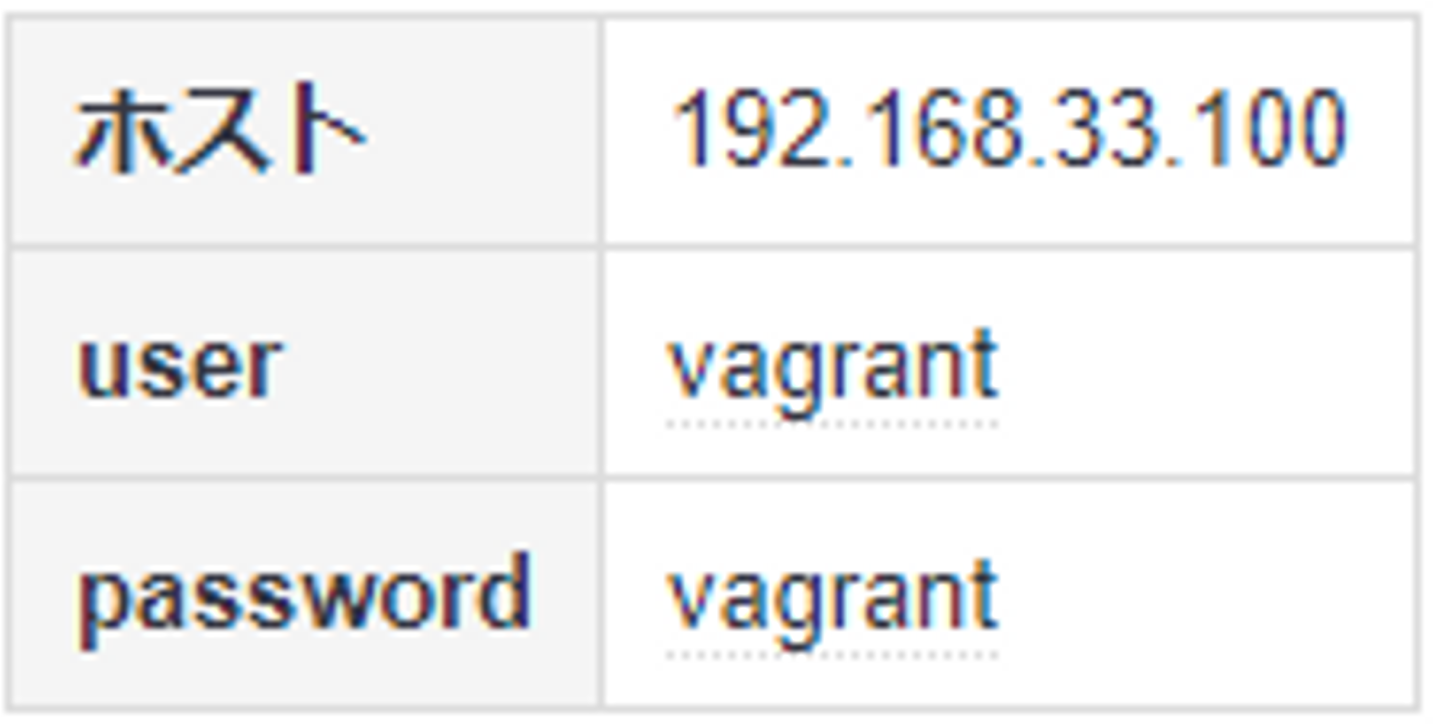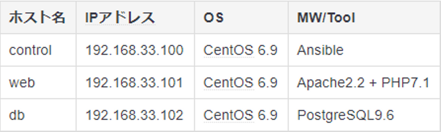 ホスト名IPアドレスOSMW/Toolcontrol192.168.33.100CentOS 6.9Ansibleweb192.168.33.101CentOS 6.9Apache2.2 + PHP7.1db192.168.33.102CentOS 6.9PostgreSQL9.6