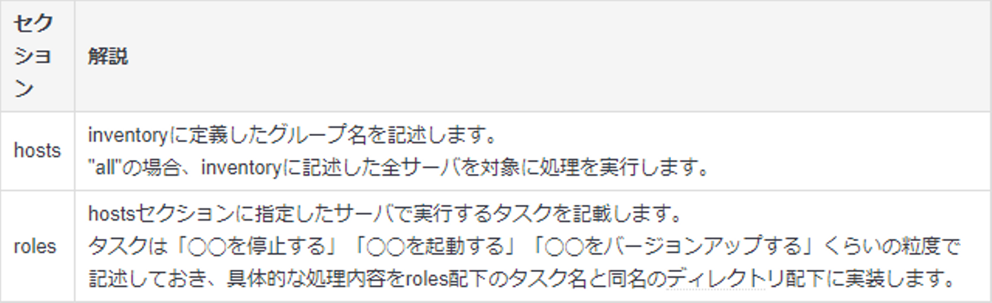 Inventoryには、サーバ名やIPアドレスなどの管理対象ノードの情報、Playbookには管理対象ノードで実行するタスクを記述します。