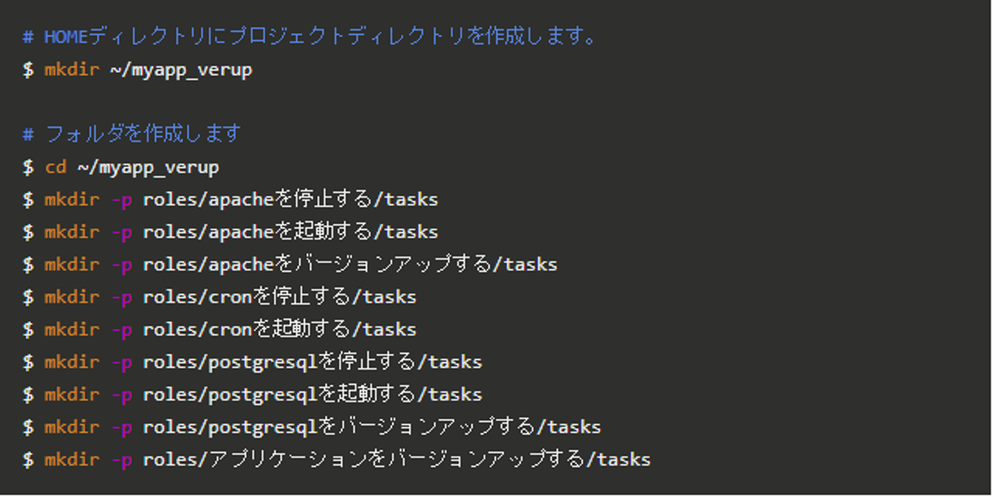 ファイル構成の項目で紹介したAnsibleプロジェクトを作成していきましょう。