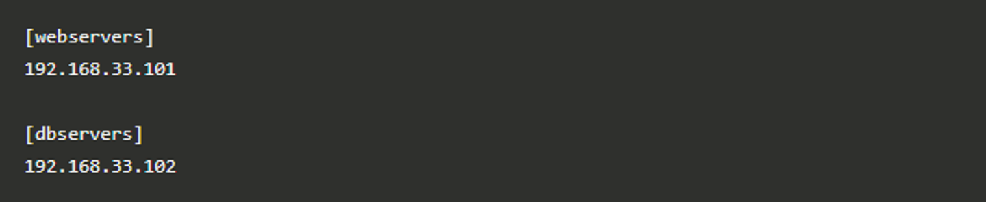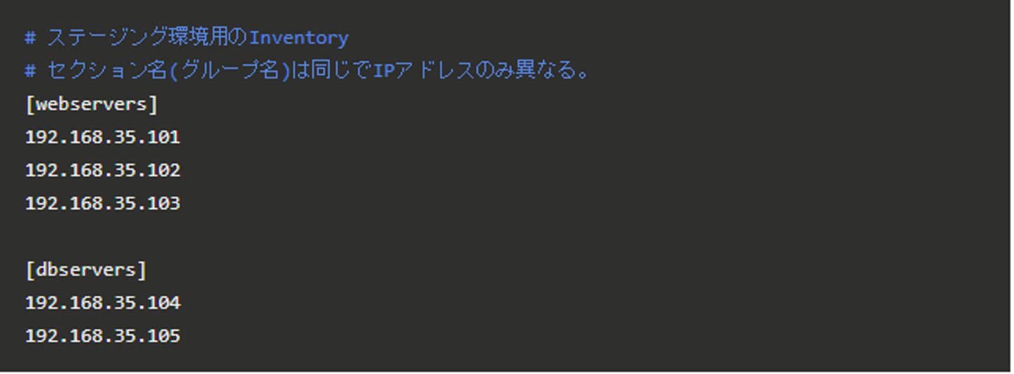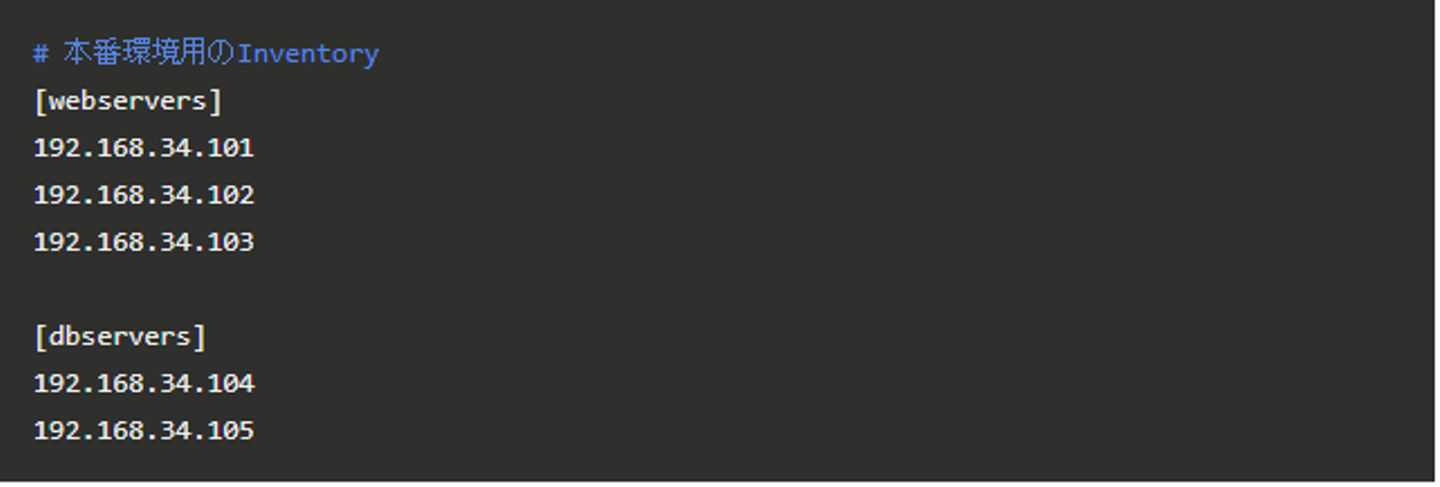 Inventoryでは、管理対象ノードのホスト名、またはIPアドレスとグループの定義を行います。 ファイルはINIファイル形式で記述します。