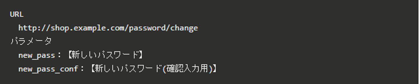 shop.example.comではユーザはIDとパスワードでログインします。利用ユーザがパスワードを変更しようとしたとき(ユーザが新しいパスワードを入力して確定ボタンを押したとき)に送信されるリクエストが下のようなものだったとします。