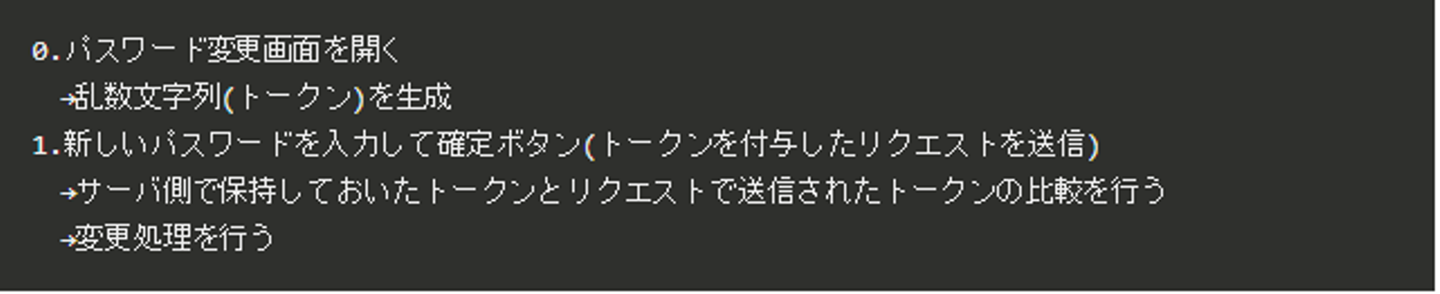 一番分かりやすい方法はユーザに確認してもらうことです。重要な処理の前にはユーザにもう一度認証を行う、つまりログインIDとパスワードの入力をしてもらうことになります。今回のパスワード変更の例ですと、以下のようになります。(数字がユーザ操作、→がサーバ処理です。)