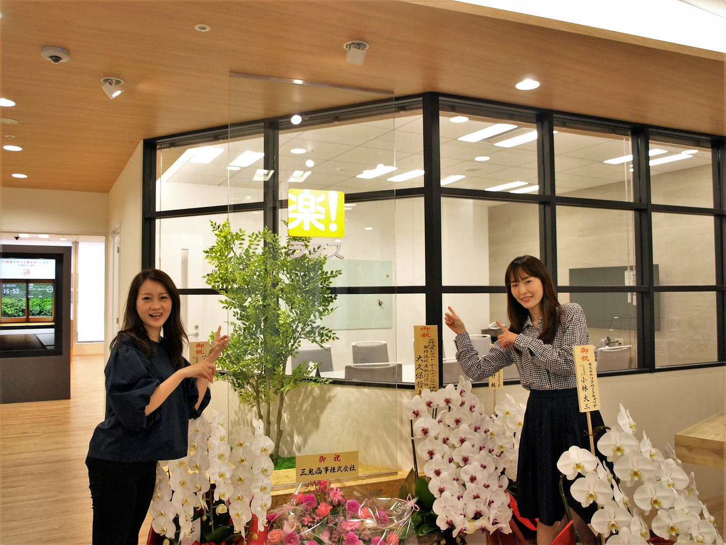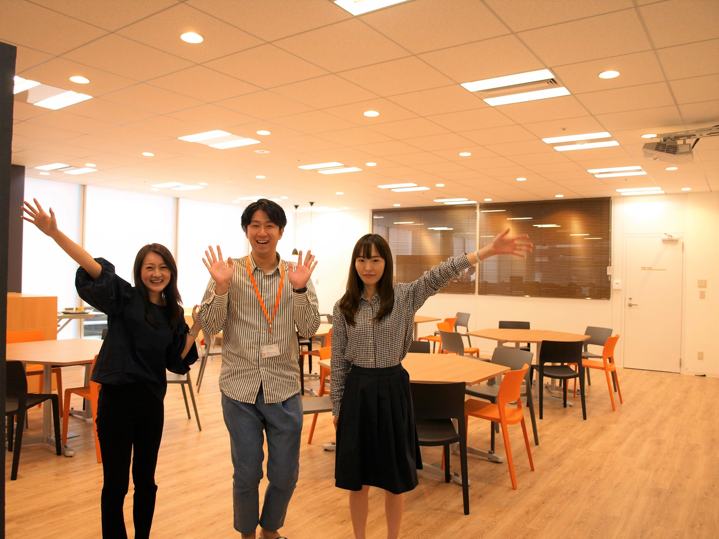 採用担当の知場さん、人事担当の藤本さんと一緒に、ぴかぴかのオフィスをご紹介します★写真は記念すべき移転初日!