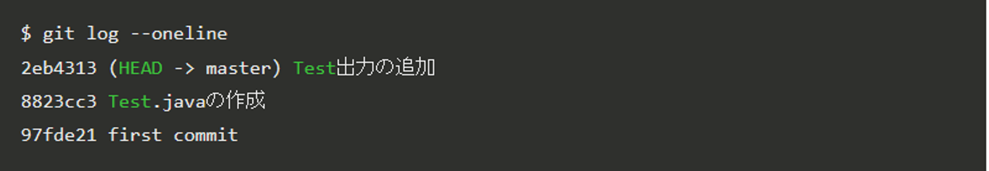 git log:最新までのコミットログを確認。git log --oneline:コミットログを簡潔に確認。