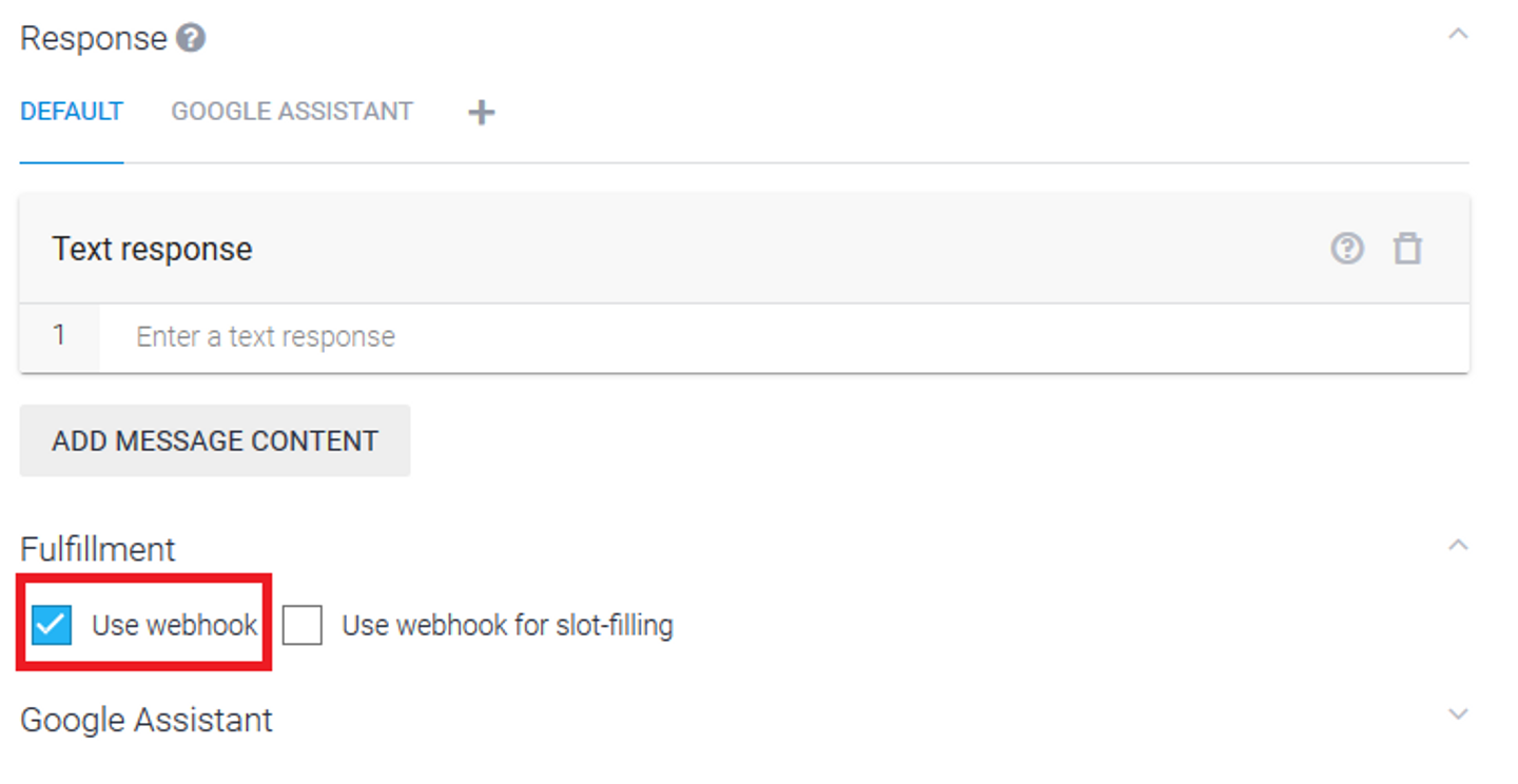 IntentからFulfillmentを呼び出すためには、Intents > Default Welcome Intent > Fulfillment > Use webhook にチェックを付けてください。