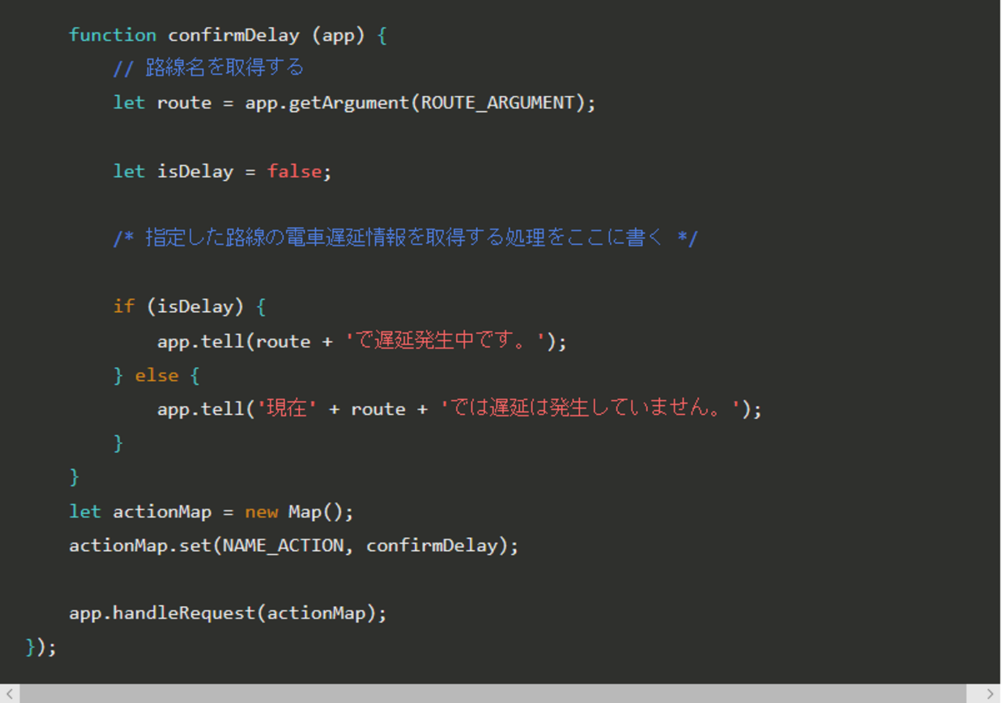 今回実装したコードは以下のようなものです。 遅延情報を取得する処理は割愛しますが、API等を利用するなどして遅延有無をisDelayフラグにセットする想定です。