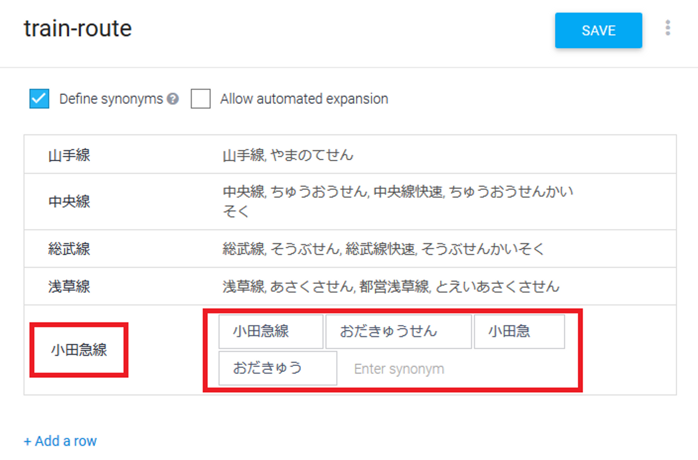 にて、「おだきゅう」は「小田急線」の同義語と定義したため、パラメータtrain-route