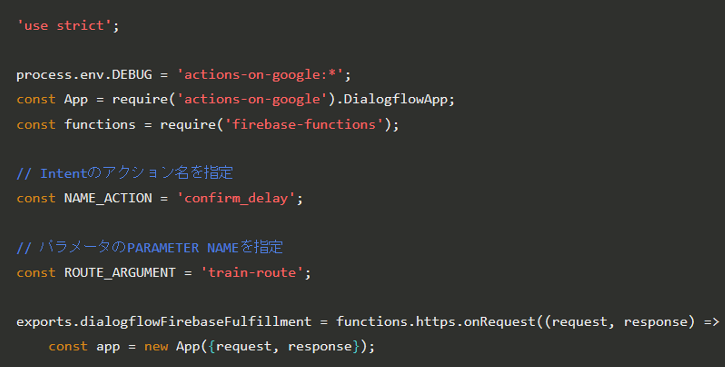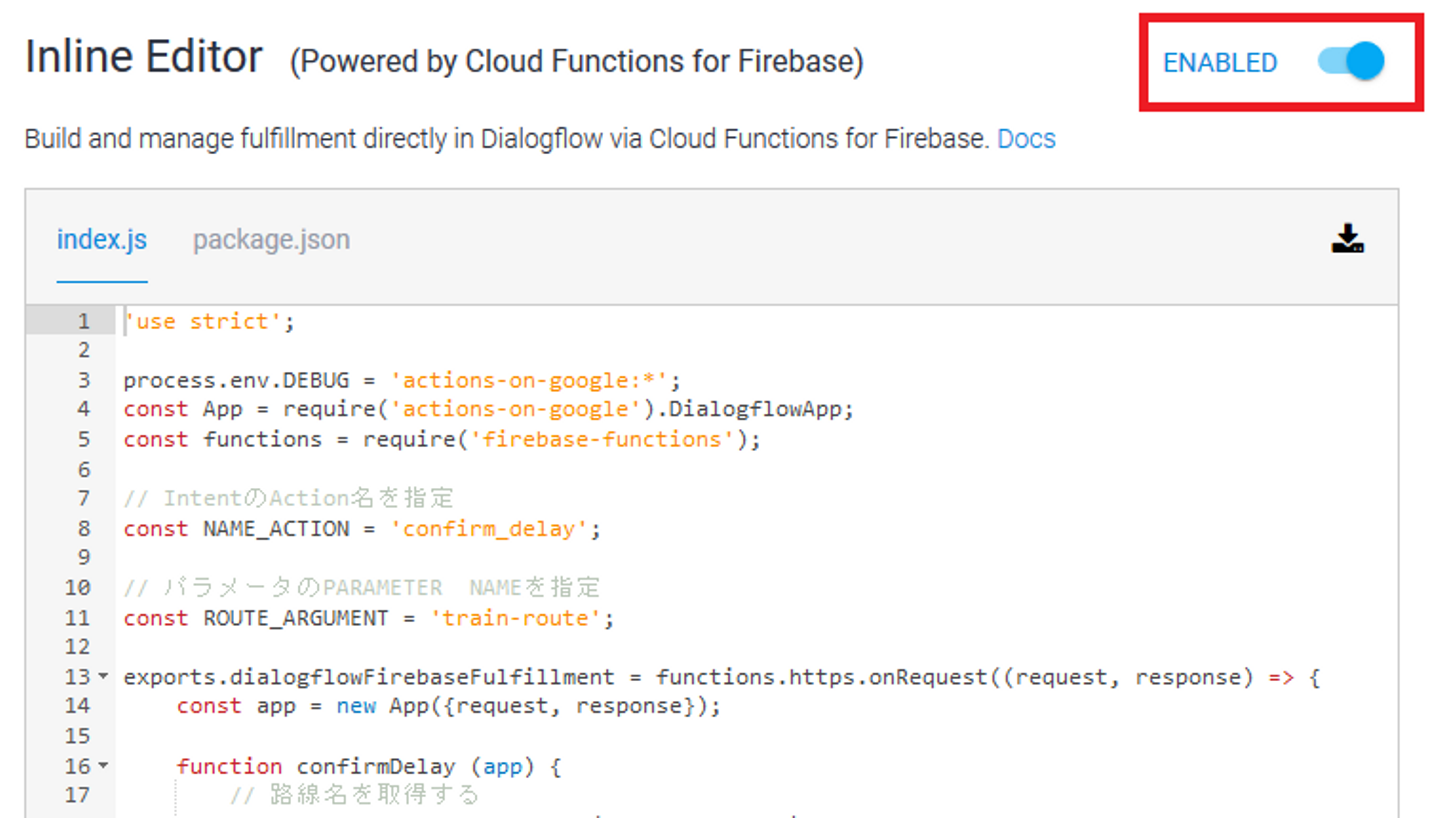 IntentとEntityを使って路線名は取得できましたので、いよいよFulfillmentで遅延情報を確認するスクリプトを書いていきましょう。