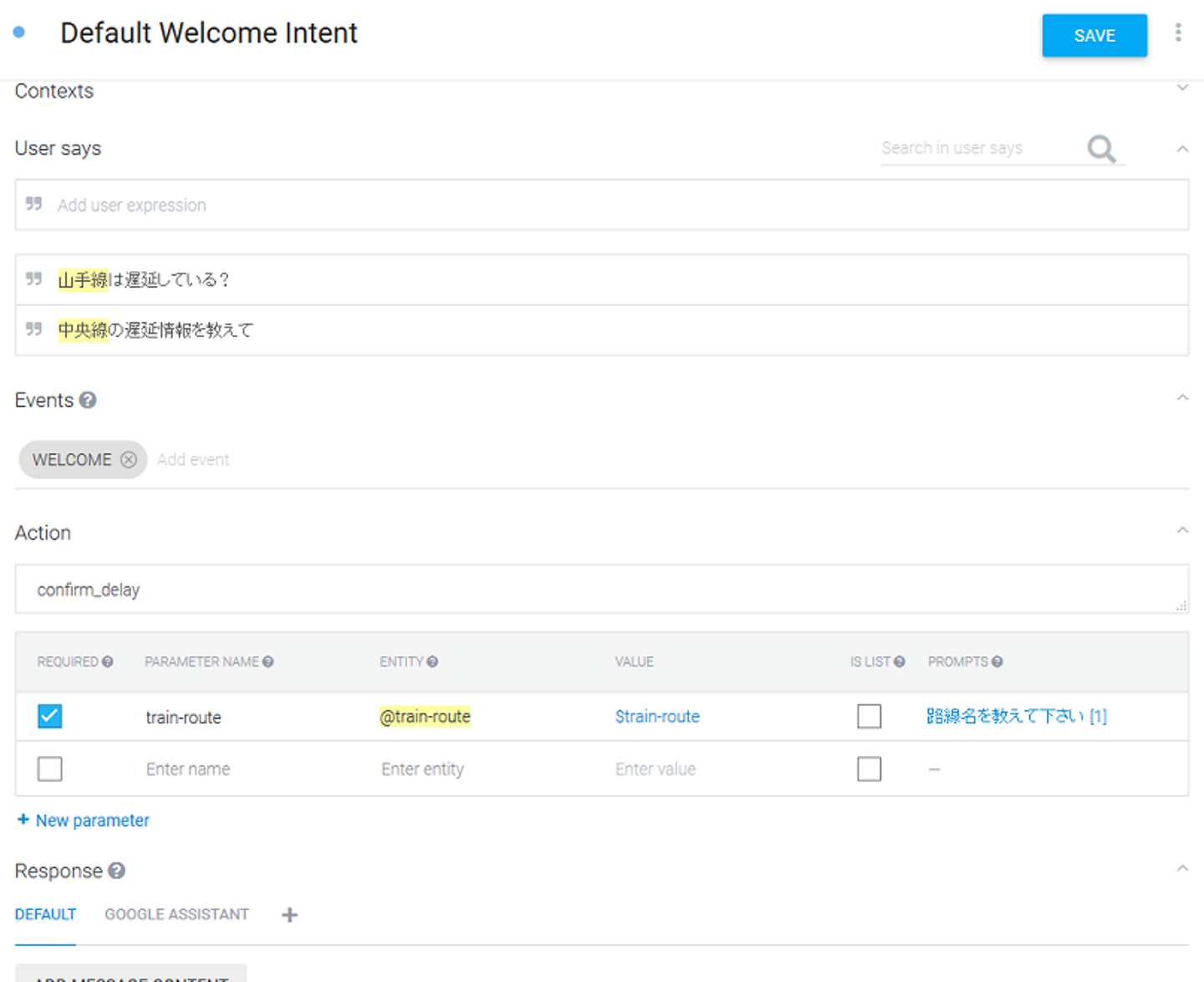 の遅延情報を教えて」という会話に反応するIntentを作成するため、Intents > Default Welcome Intentで以下のように編集しました。