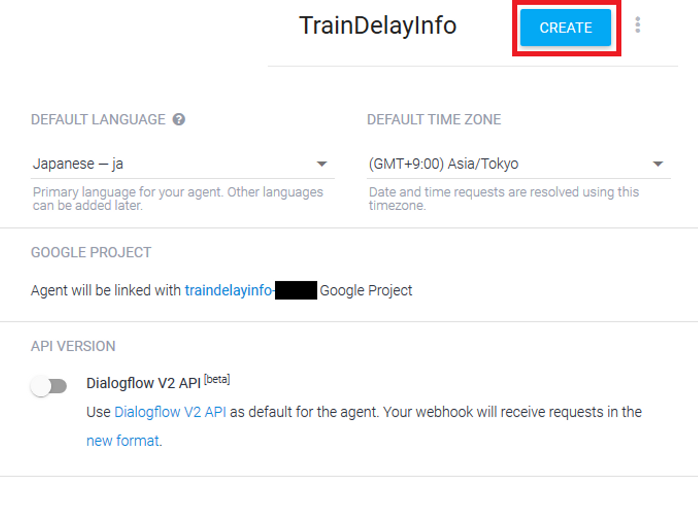 ここからDialogflow上での設定になります。 コンソールには以下のような画面が表示されるので、CREATEをクリックします。