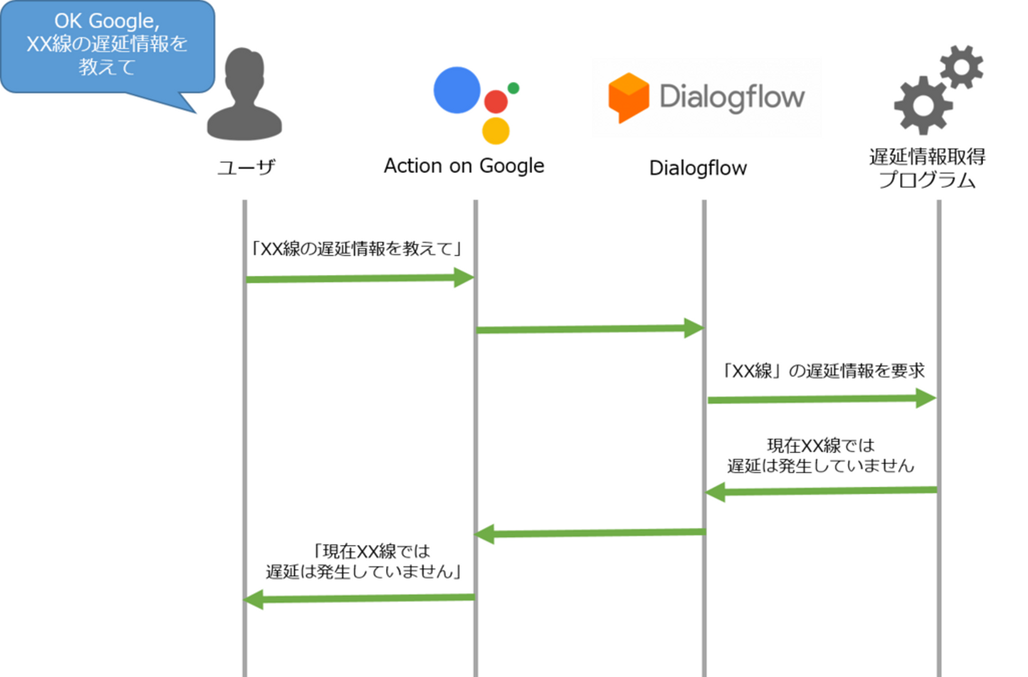 - 遅延情報取得プログラム:今回作成するスクリプトです。遅延情報の取得処理はこのスクリプトで行います。Dialogflow 上でFulfillmentとして設定することで Dialogflow と連携することができます。